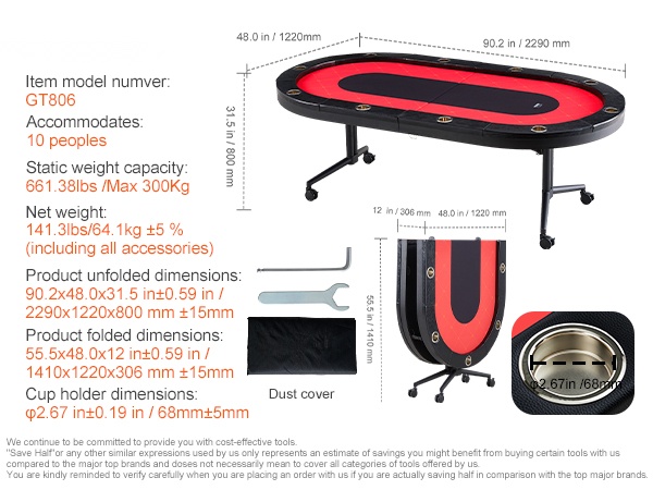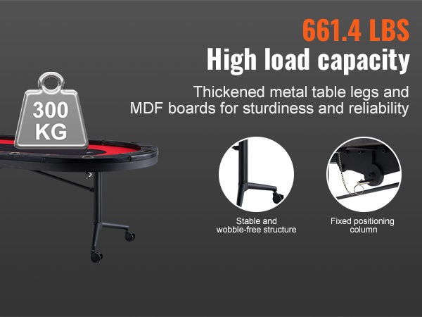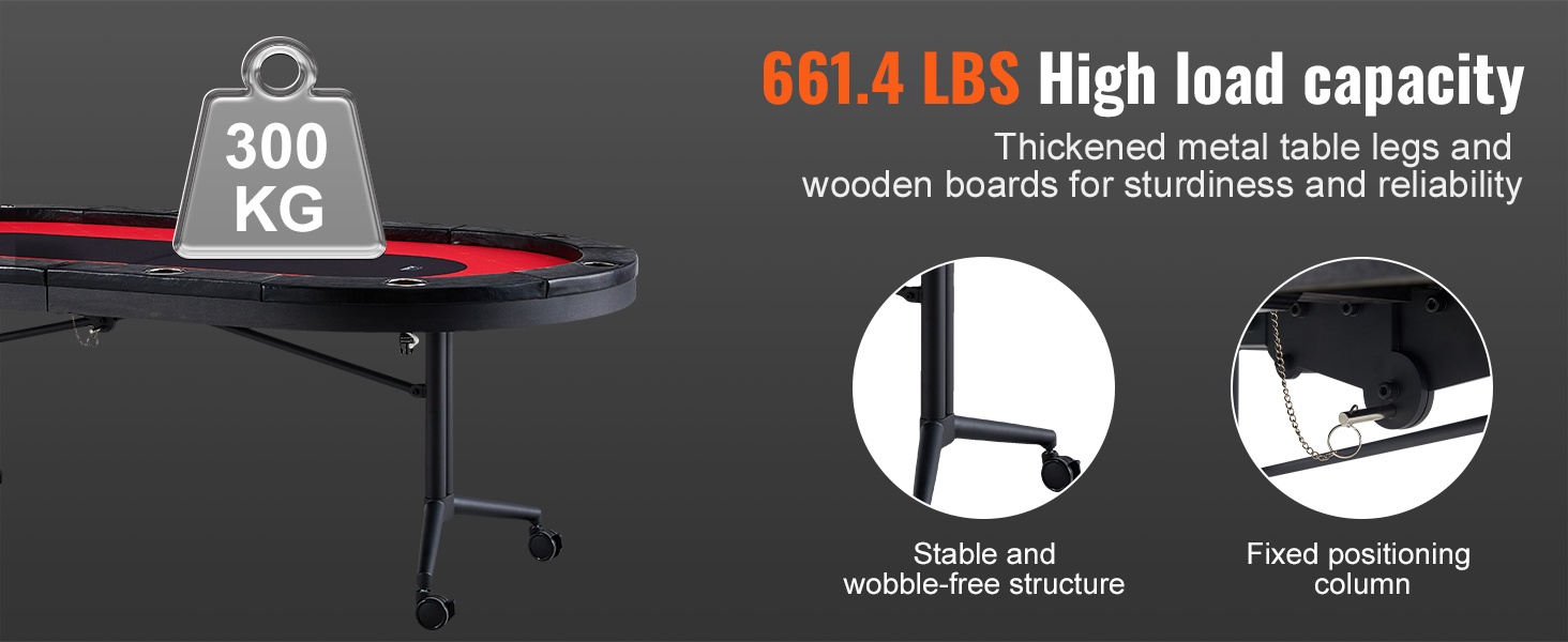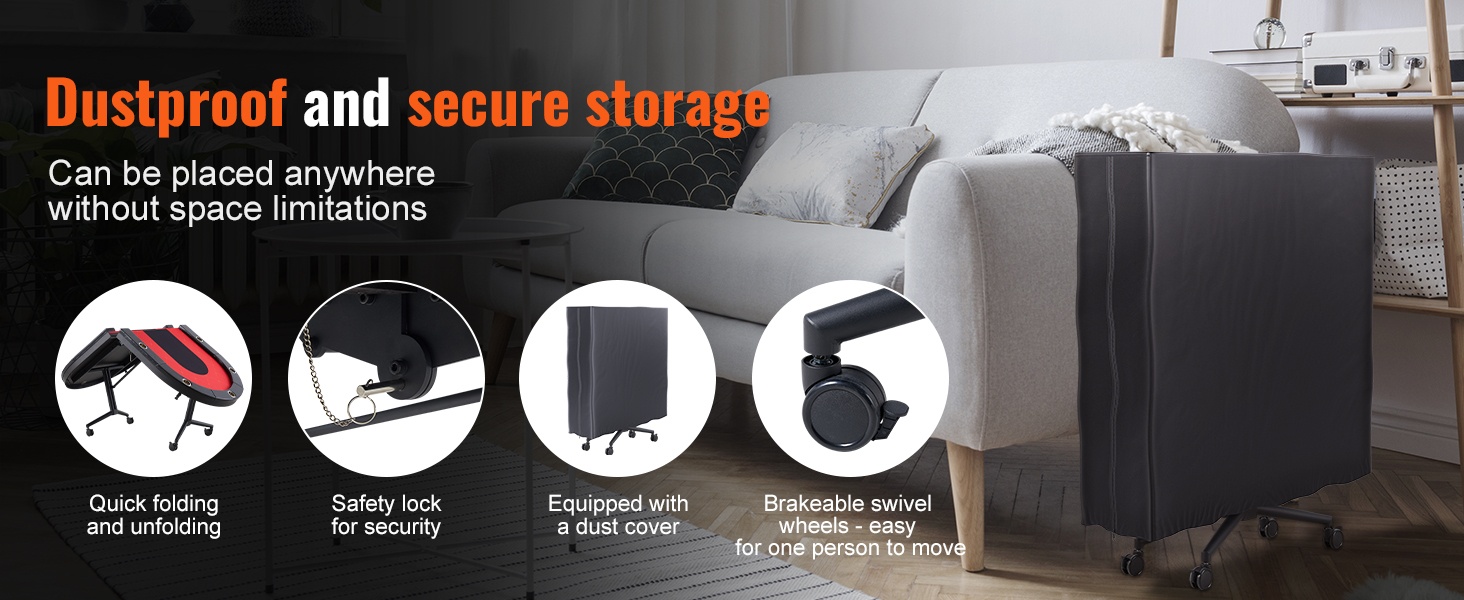 Soikea casinotyylinen pöytä on nopea koota ja taittaa kasaan. Taittomekanismin turvalukko estää pöytää painumasta kasaan tai löystymästä käytön aikana. Mukana tulevaa pölynsuojapeitettä on helppo käyttää, kun pöytä on varastossa, jotta se pysyy puhtaana.