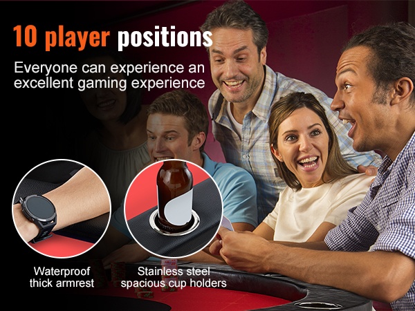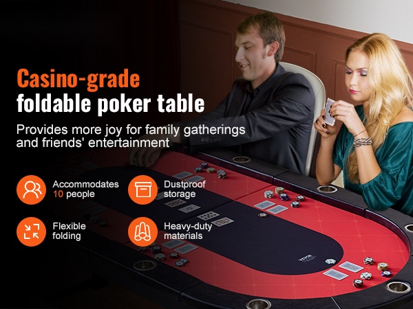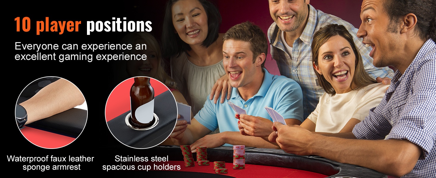 Taitettava ja vankka pokeripöytä, joka on suunniteltu rentoon viihdekäyttöön. Pöydän ääreen mahtuu samanaikaisesti jopa 10 pelaajaa, ja se sopii esimerkiksi Texas Hold'em -pokeriin, blackjackiin ja muihin korttipeleihin.