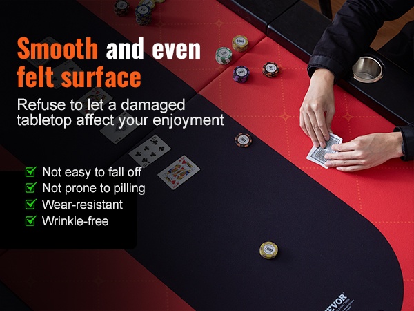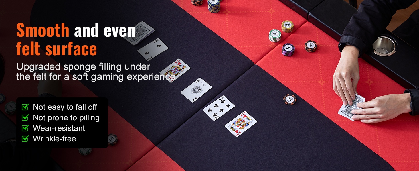 Pöydän pelipinta on sileää ja kestävää huopakangasta. Korttien katsominen, pelimerkkien käsittely ja korttien näyttäminen sujuvat ilman tökkimistä. Pinta ei nukkaannu tai vaurioidu helposti pitkäaikaisessakaan käytössä.