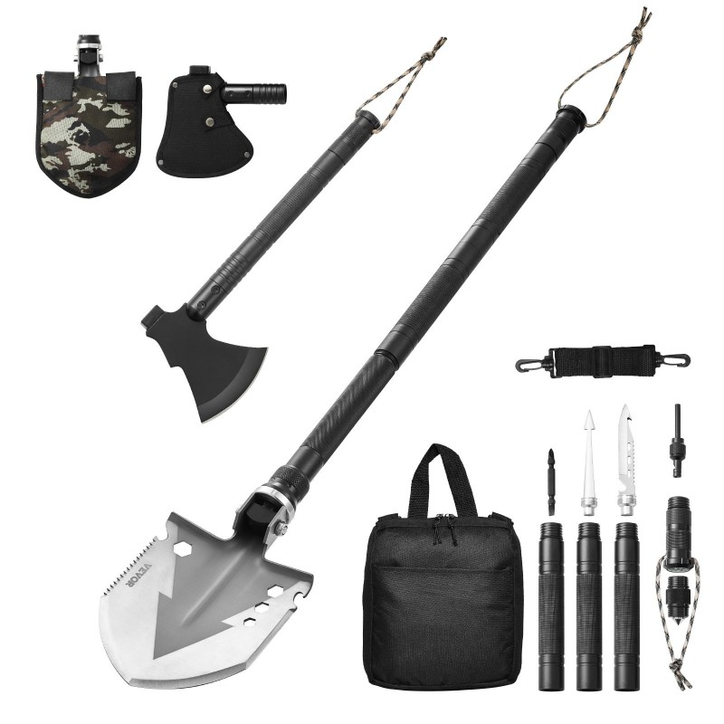 Tämä taitettava retkilapio–kirves -yhdistelmä on suunniteltu ulkoiluun, vaelluksille, leirintään ja selviytymistilanteisiin. Kompakti setti sisältää useita työkaluja, joilla hoituvat kaivaminen, hakkaaminen, pilkkominen ja monet muut tehtävät maastossa ja kotona.