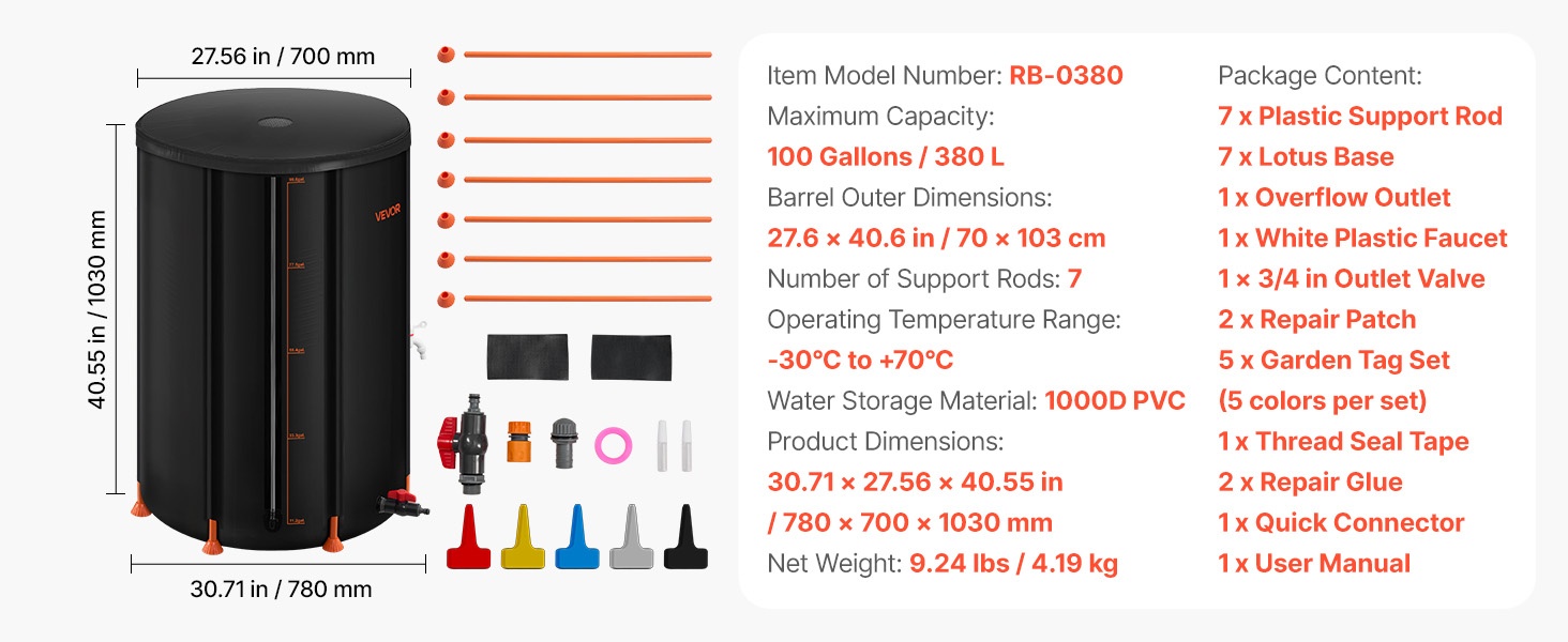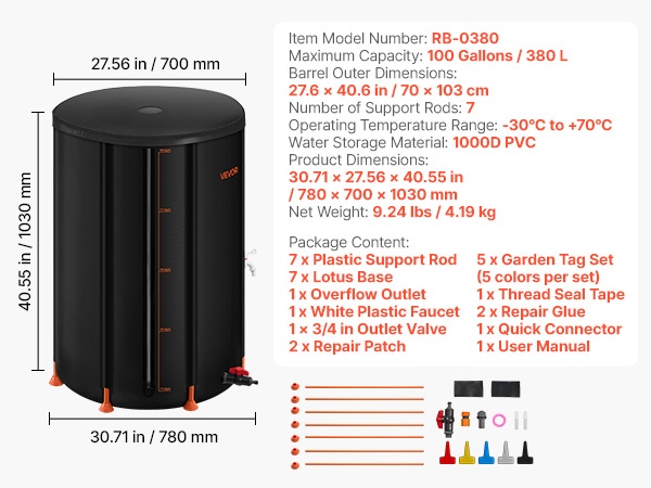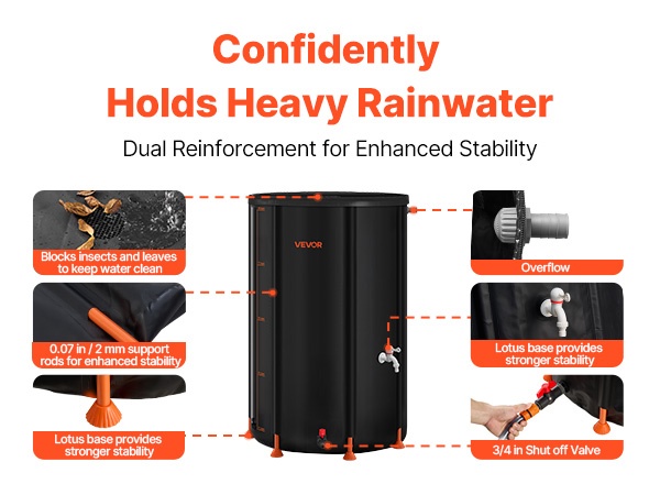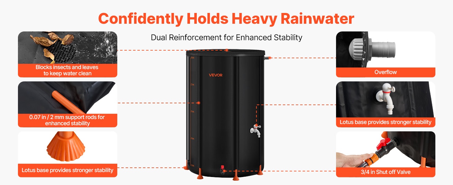 Lootuksenmuotoinen pohja lisää vakautta ja 2 mm paksut tukitangot säilyttävät säiliön muodon myös täytenä. Verkkokansi estää hyönteiset ja lehdet, ja 3/4-tuuman pikaisesti suljettava venttiili sekä hana helpottavat vedenottoa.