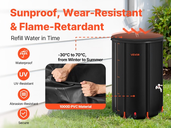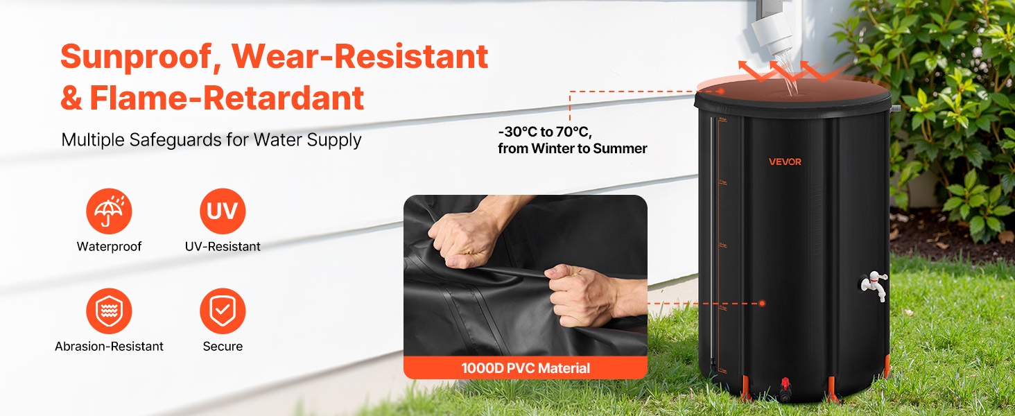 Sadevesisäiliö on valmistettu 500D PVC-materiaalista, joka on vedenpitävä, UV-säteilyä estävä, kulutusta kestävä ja myrkytön. Käyttölämpötila-alue -30℃ – +70℃ varmistaa, että säiliö toimii luotettavasti niin kuumina kesinä kuin pakkastalvina.