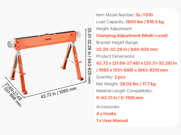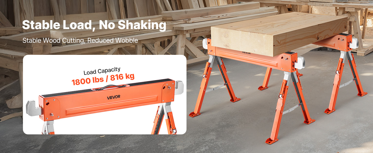 Taitettava sahapukki 2 kpl, kantavuus 816,5 kg, säädettävä korkeus, teräsjalat ja liukumattomat jalat
