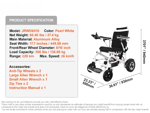 Taitettava sähköpyörätuoli JRWD6010, kantavuus 136 kg, toimintasäde 20 km