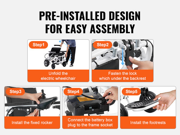 Sähköpyörätuoli on suunniteltu helppoon asennukseen, jotta sen saa käyttöön nopeasti ilman monimutkaista kokoamista. Käyttäjä voi seurata yksinkertaisia vaiheita ja saada tuolin nopeasti valmiiksi ilman raskaita asennustöitä.