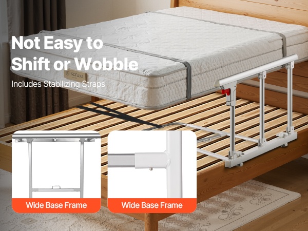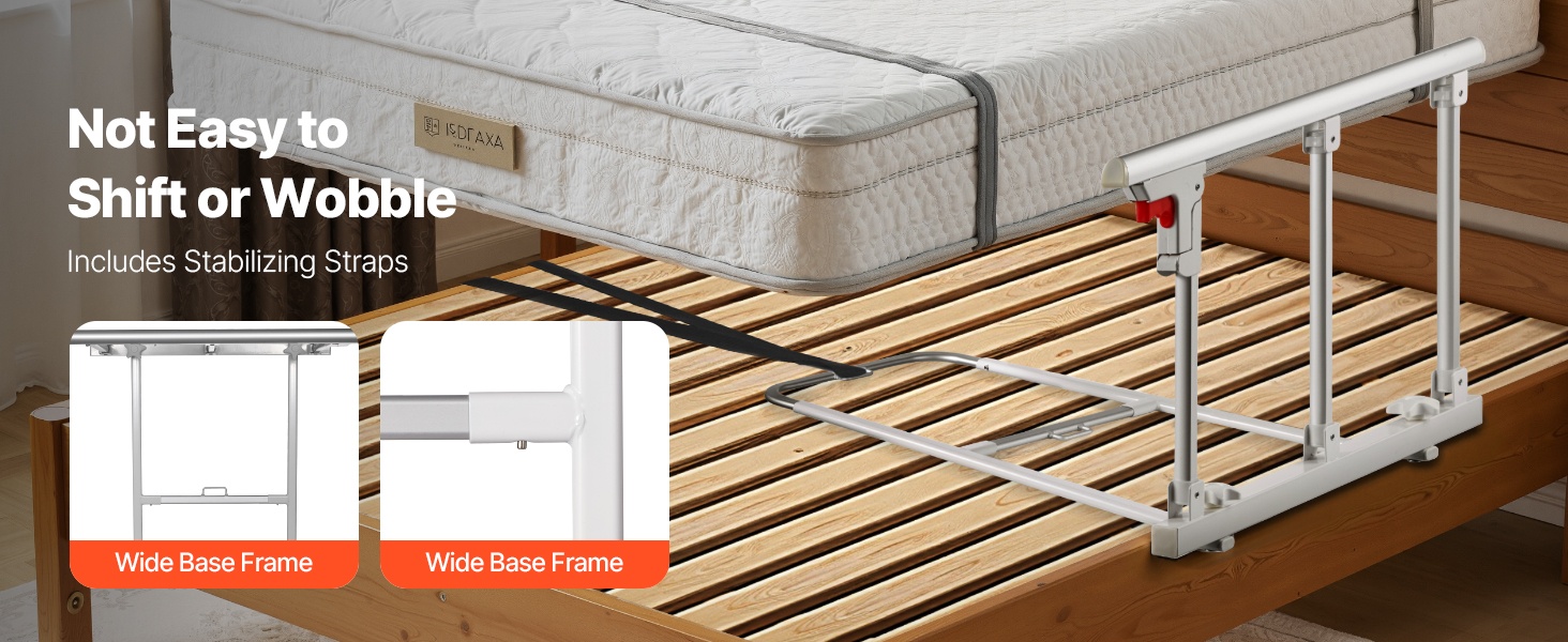Mukana tulevat kiinnityshihnat lukitsevat kaiteen tukevasti paikoilleen, jotta se ei heilu tai siirry käytön aikana. Levennetty pohjarunko ja keskellä kulkeva yhdysputki lisäävät kosketuspintaa sängyn kanssa ja parantavat vakautta entisestään.