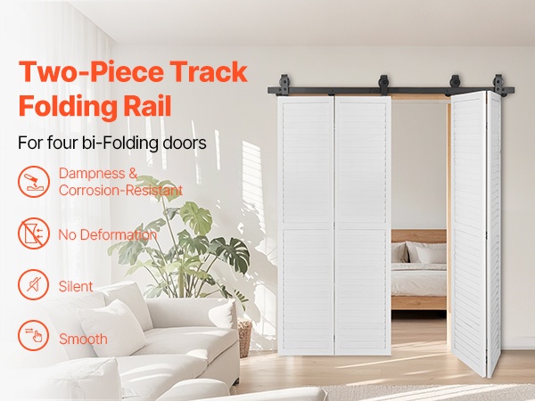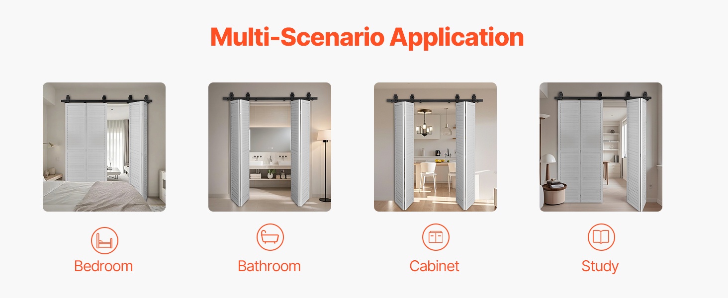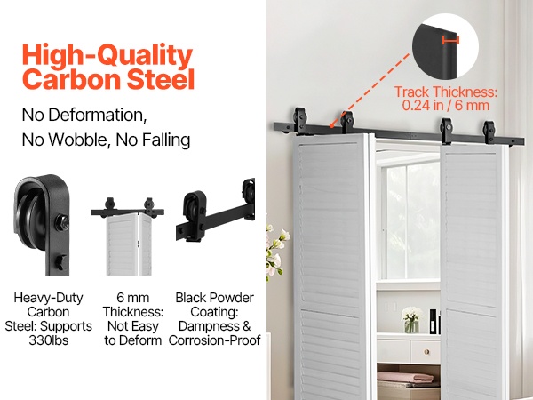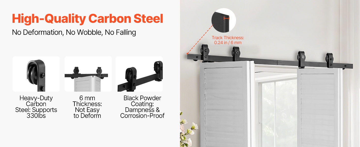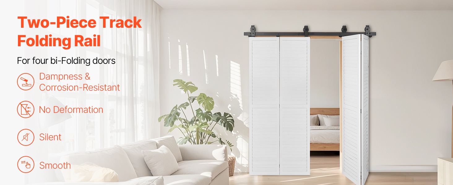 Tämä kaksiosainen taittuva liukuoven kiskosarja on valmistettu kestävästä hiiliteräksestä ja se kestää jopa 330 lbs / 150 kg kokonaiskuorman. Taittuva rakenne säästää tilaa ja sopii erityisesti kapeisiin tiloihin, kuten vaatekaappeihin, kodinhoitohuoneisiin ja keittiön komeroihin. Musta jauhemaalaus parantaa korroosionkestävyyttä kosteissa tiloissa.