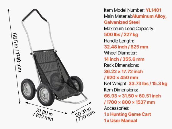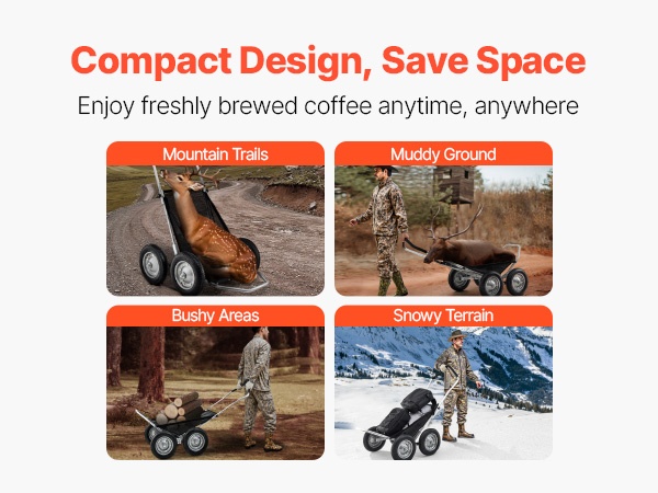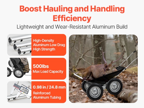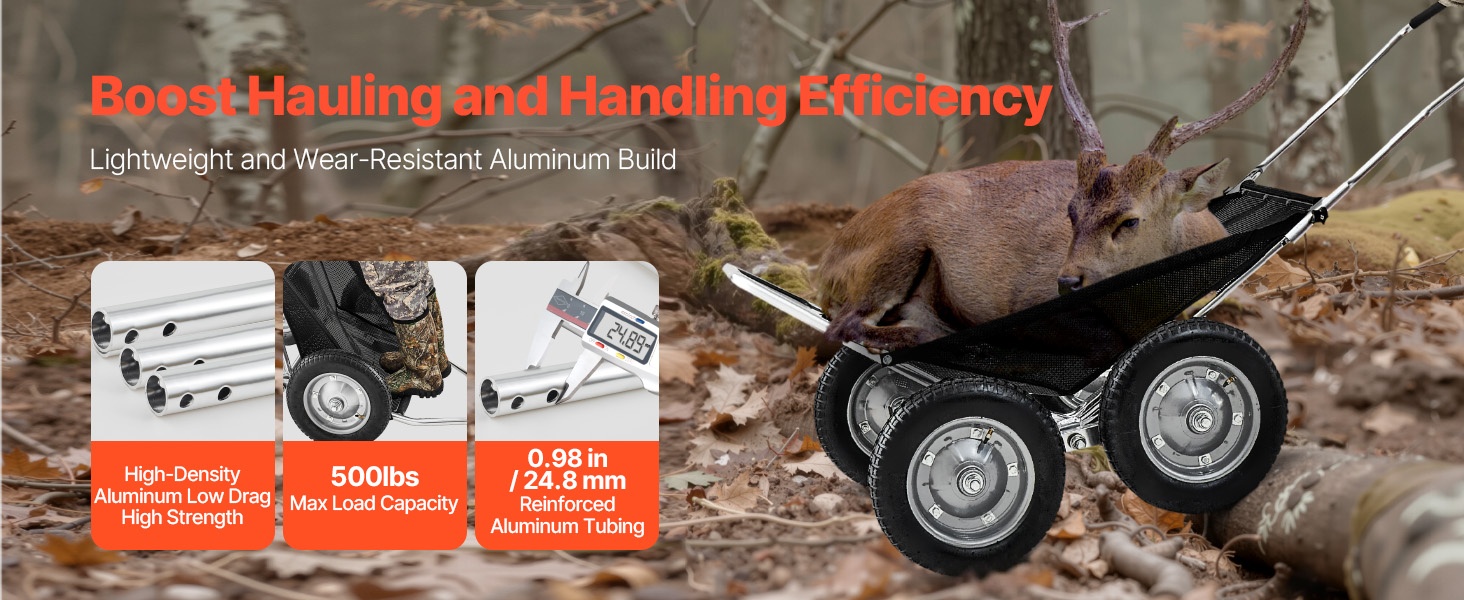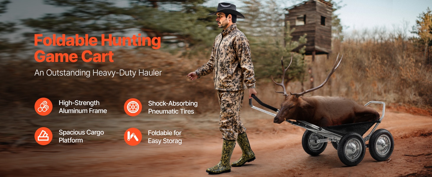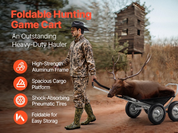 Tämä metsästyskärry on käytännöllinen kuljetusväline ulkoiluun, metsästykseen ja retkeilyyn. Sen avulla voit siirtää saaliin, varusteet ja tarvikkeet maastossa vaivattomammin. Rakenne on kestävä ja helppo käyttää, joten kärry soveltuu toistuvaan käyttöön erilaisissa olosuhteissa.