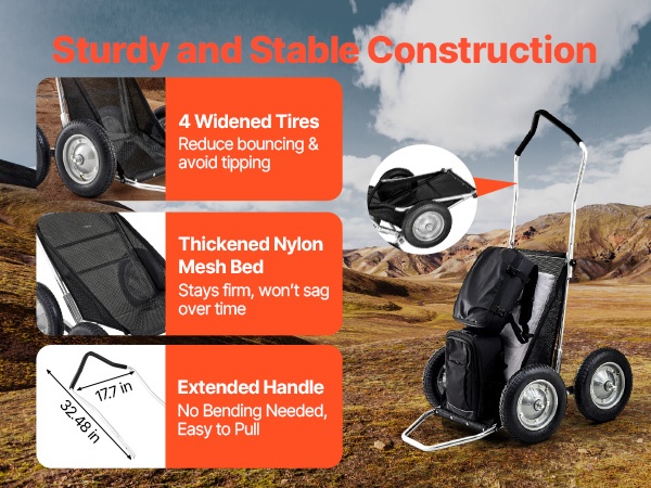 Kärryssä on neljä leveää, iskuja vaimentavaa rengasta, jotka helpottavat liikkumista kivikkoisessa, mutaisessa tai lumisessa maastossa. Vahvistettu nailonverkkoalusta kestää hyvin kuormaa eikä painu helposti kuopalle. Ergonominen aisarakenne vähentää kumartelun tarvetta ja tekee vetämisestä miellyttävämpää.