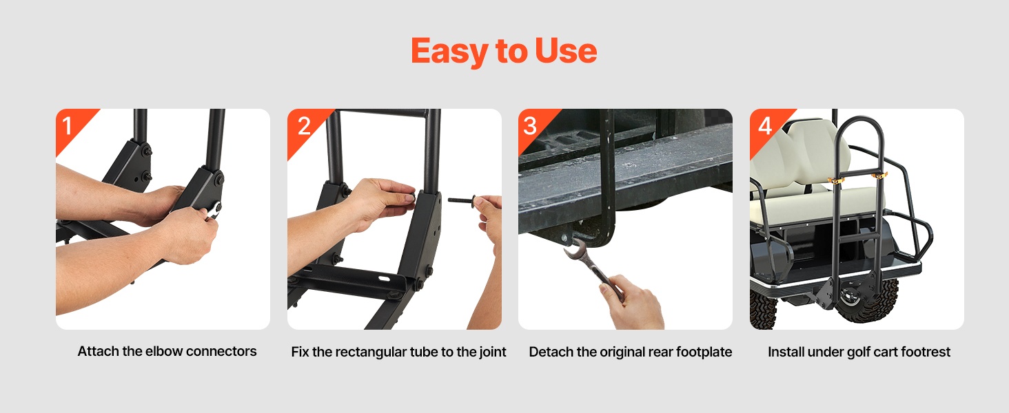 Käsikaari on suunniteltu sopimaan useimpiin golfkärryihin, joissa on metallinen jalkalevy. Asennus onnistuu olemassa oleviin kiinnityspisteisiin, eikä kärryyn tarvitse tehdä porauksia tai muita muutoksia.