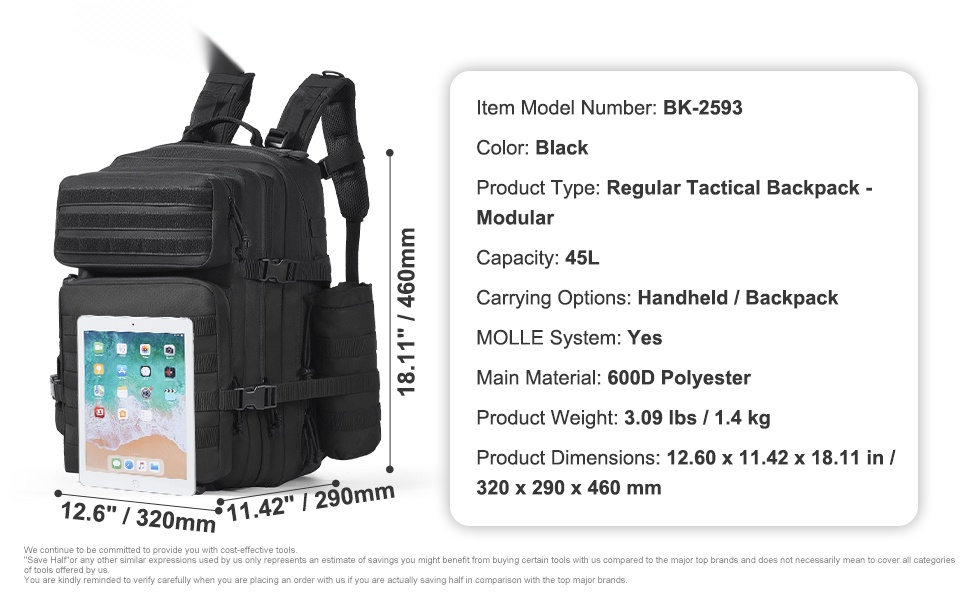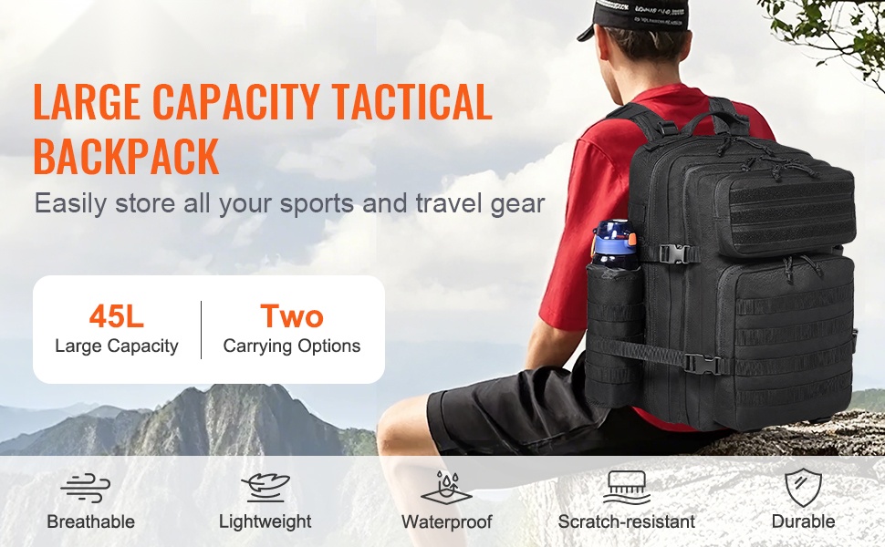 Taktinen 40L reppu, jossa on käsikahva ja säädettävät olkahihnat. Tilavuus riittää vaatteille, kengille ja muille matka- tai treenitarvikkeille. Reppu on valmistettu hengittävästä, kevyestä, vedenpitävästä ja naarmuuntumista kestävästä materiaalista, joten se sopii hyvin pitkäaikaiseen käyttöön.