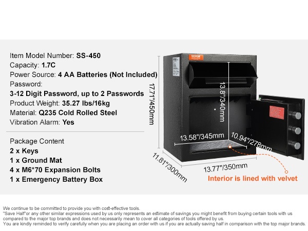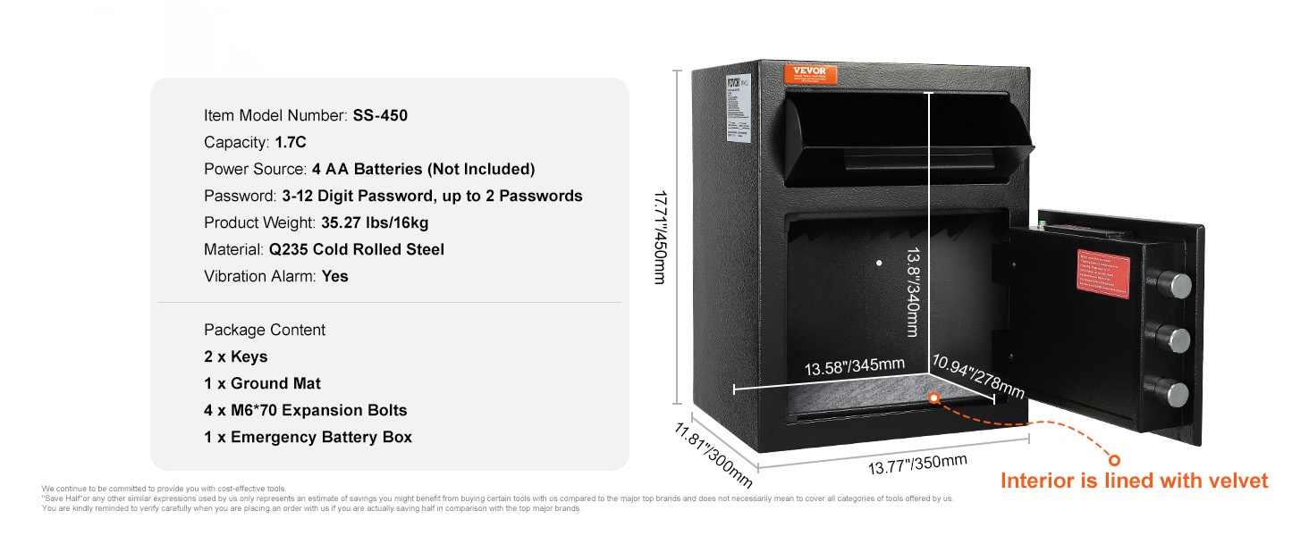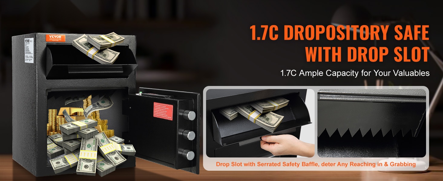 Tallelokeron tilavuus on 2.5C, ja sen ulkomitat ovat 20.27" x 13.97" x 13.97" (515 x 355 x 355 mm). Edessä oleva pudotusaukko helpottaa turvallisia talletuksia ilman, että ovea tarvitsee avata, mikä parantaa sisältöjen yksityisyyttä ja vähentää luvattoman pääsyn riskiä.