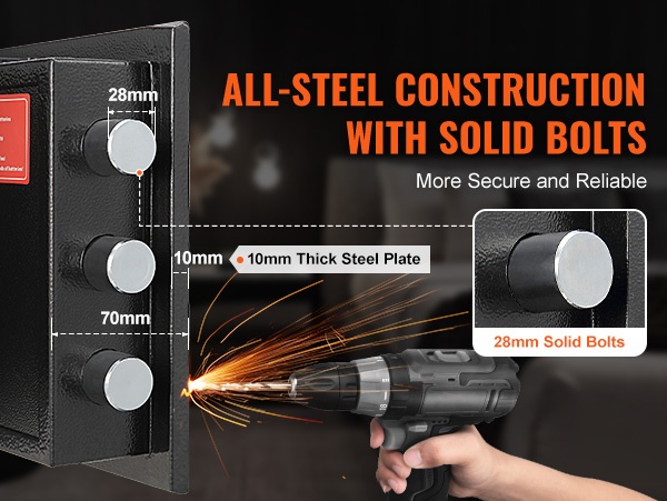 Tallelokero on valmistettu yhdestä kappaleesta 10 mm paksua terästä, mikä tekee rakenteesta jämäkän ja luotettavan. Kolme 28 mm:n massiivista pulttia lukitsevat oven tukevasti ja auttavat estämään varkaudet, tunkeutumiset ja muun luvattoman käytön sekä koti- että yritysympäristöissä.