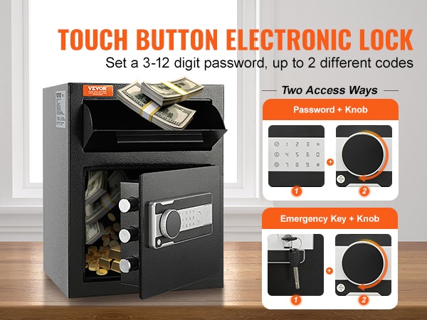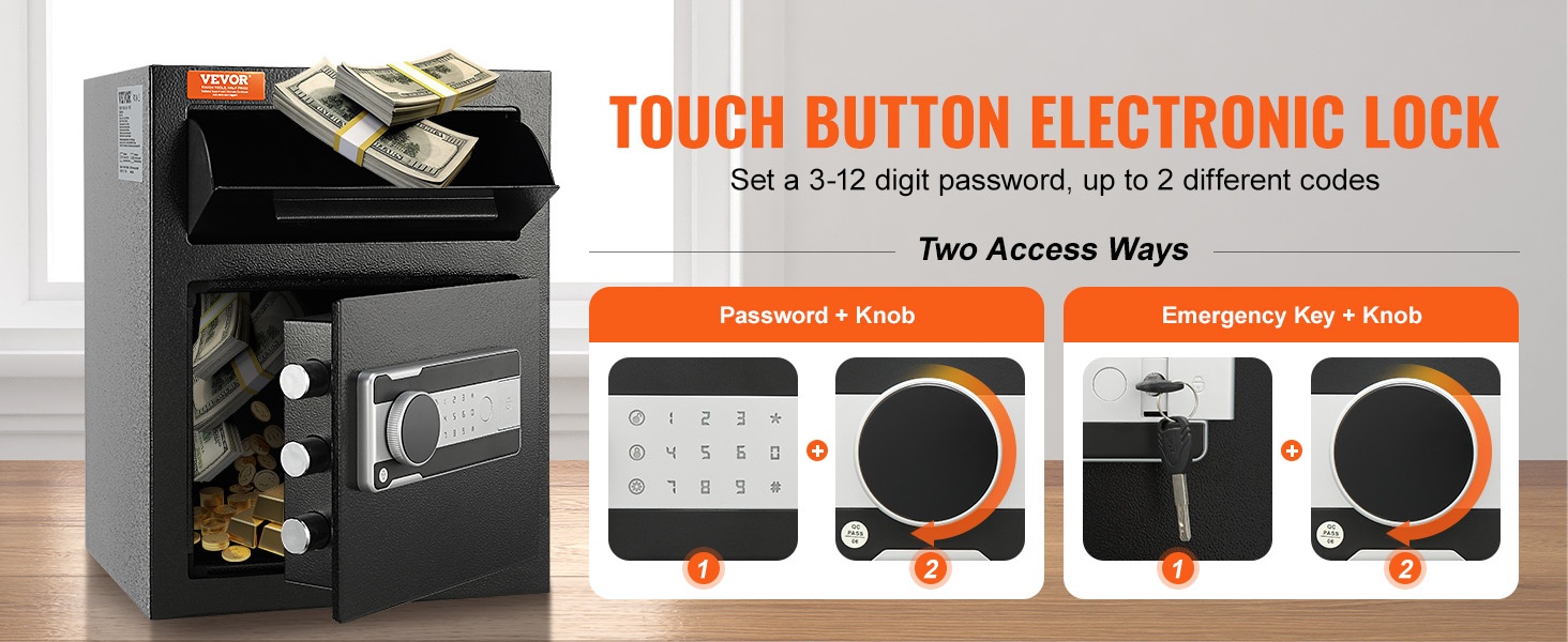Voit asettaa 3–12 numeron salasanan ja luoda jopa 2 erillistä koodia arvoesineiden suojaamiseksi. Kahden eri avaustavan ansiosta lukon käyttö on varmaa kaikissa tilanteissa: hätäavain + nuppi unohtuneen salasanan tai virran loppumisen varalta sekä salasana + nuppi päivittäiseen käyttöön.