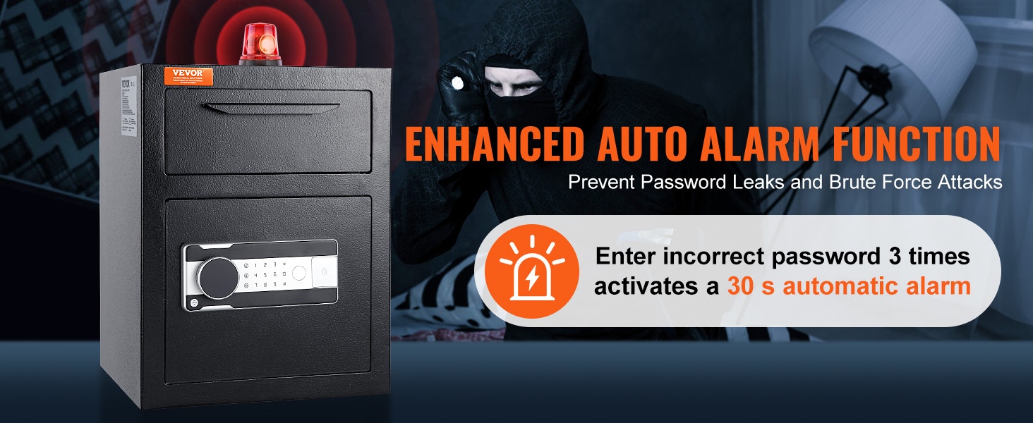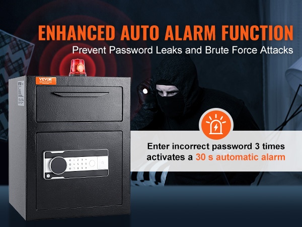 Pudotusaukollinen tallelokero on varustettu älykkäällä 30 sekunnin automaattisella hälytystoiminnolla. Jos joku yrittää arvata salasanan ja syöttää väärän koodin 3 kertaa peräkkäin, tallelokero käynnistää automaattisen 30 sekunnin hälytyksen, jolloin ehdit reagoida nopeasti.