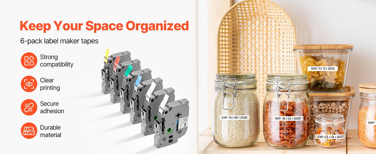 - Paketti sisältää 6 värillistä tarranauhaa erilaisiin merkintätarpeisiin.