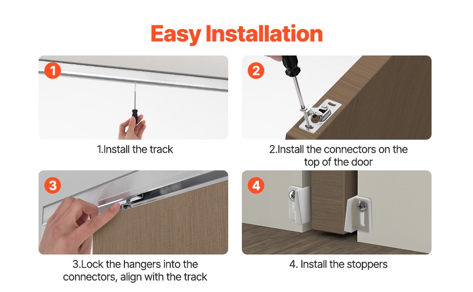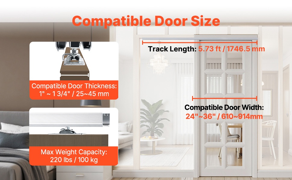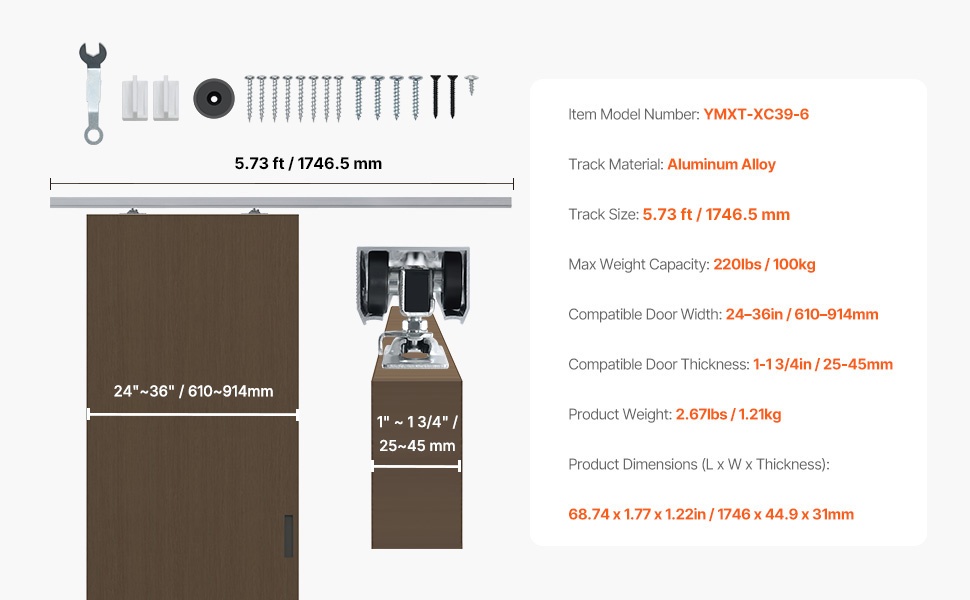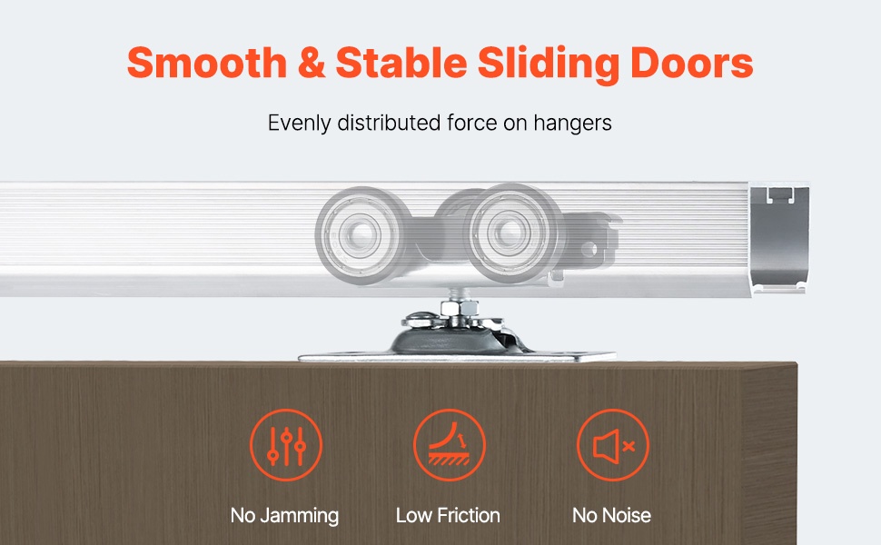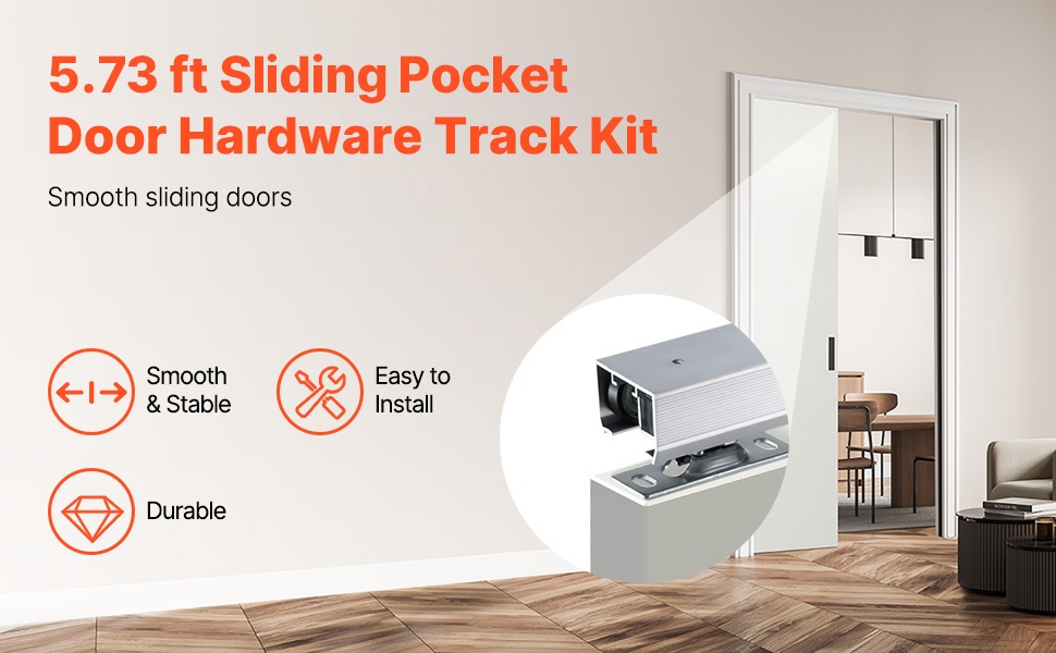 Tämä liukuva taskuoven kiskosarja sopii olohuoneisiin, keittiöihin, makuuhuoneisiin, kylpyhuoneisiin ja muihin sisätiloihin. Korkealaatuinen alumiinikisko ja kolmen pyörän ripustinjärjestelmä varmistavat tasaisen ja vakaan liu’un.