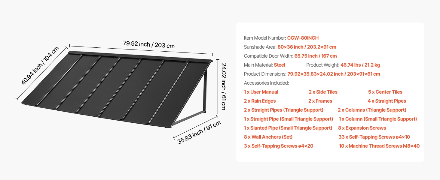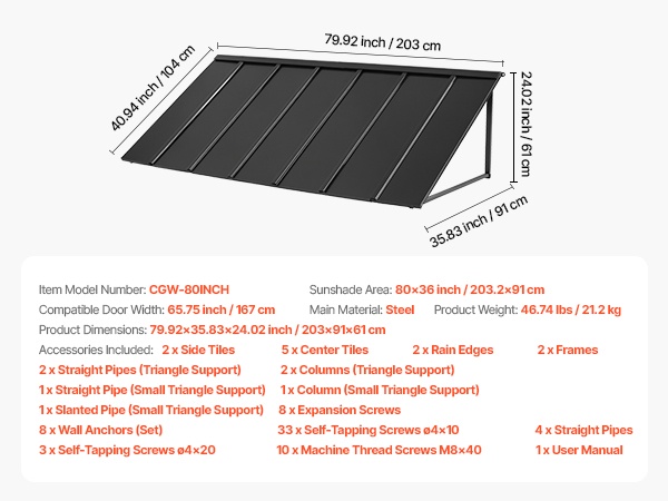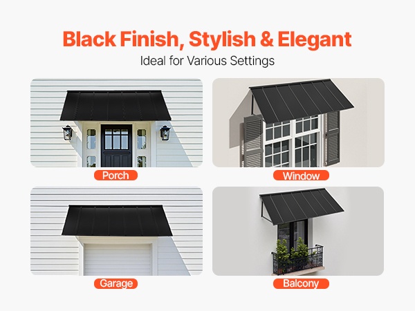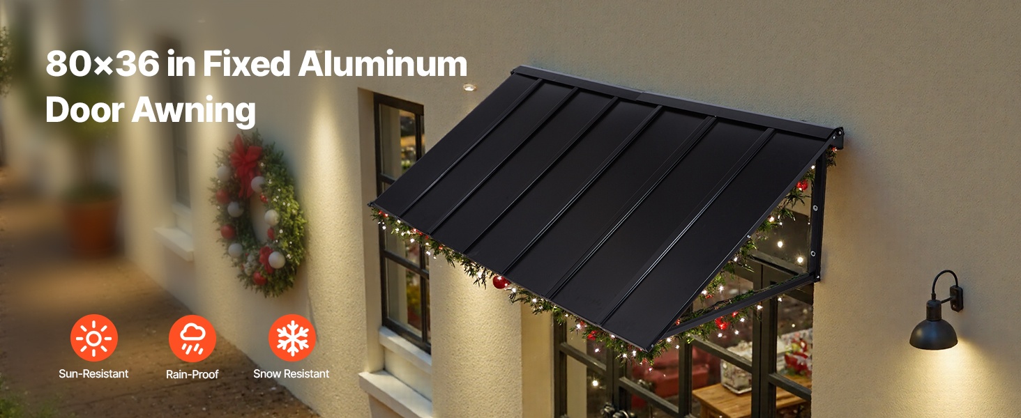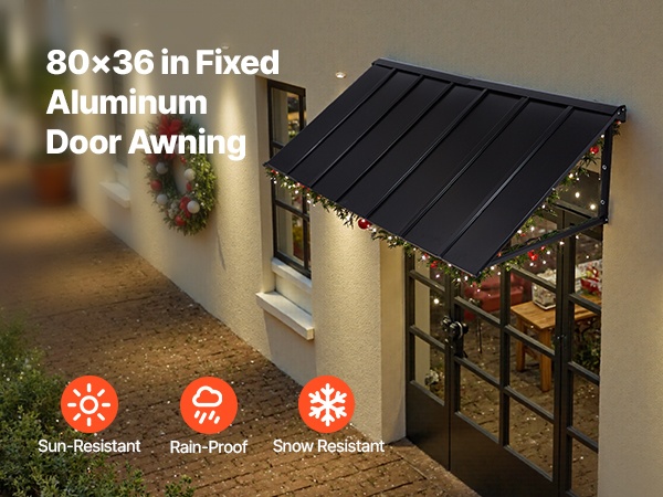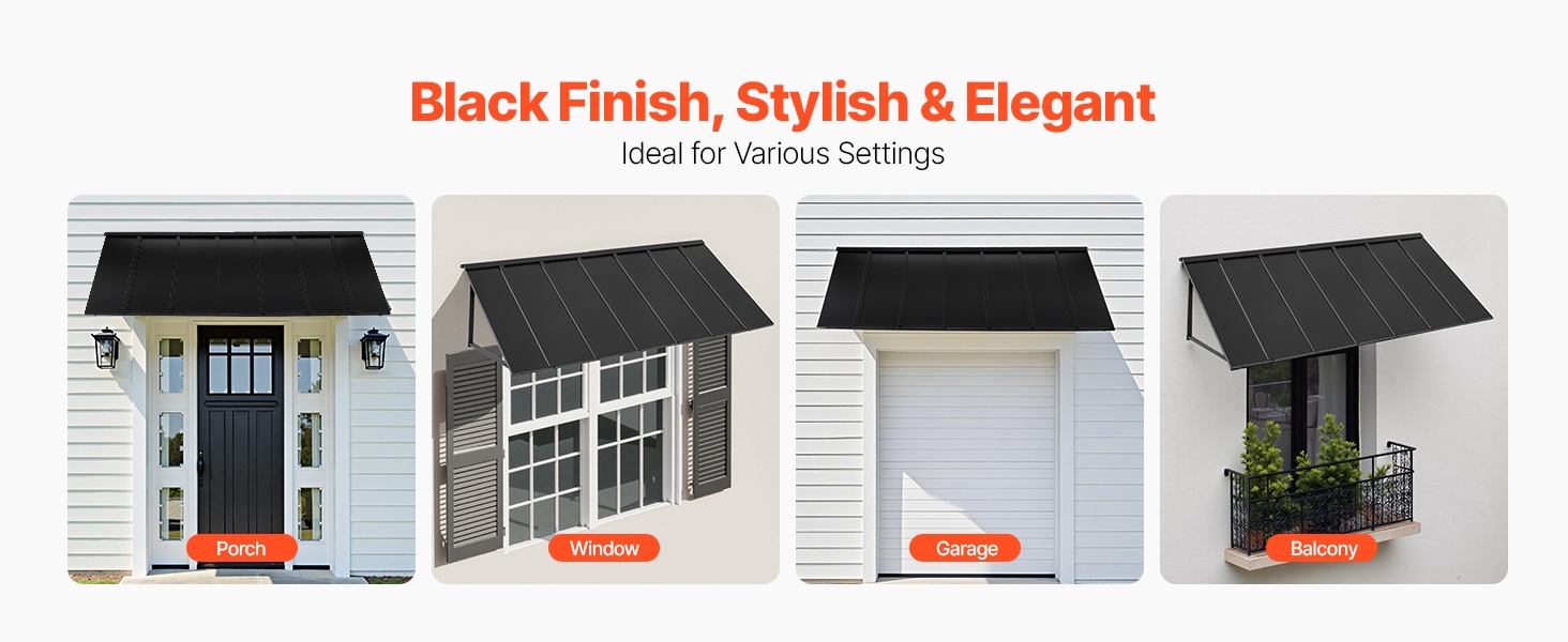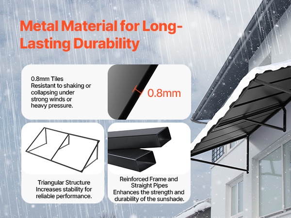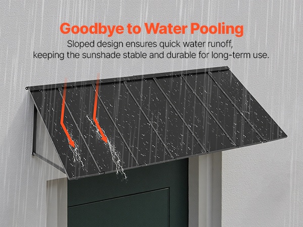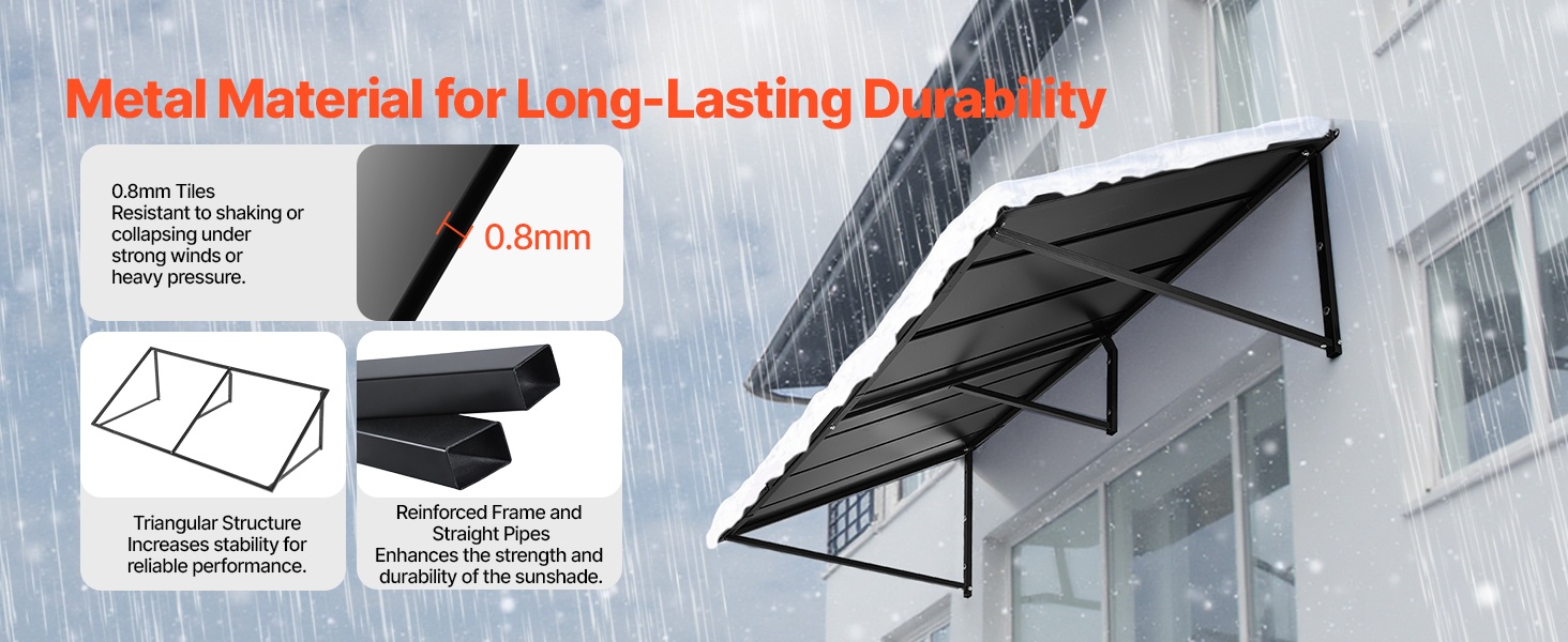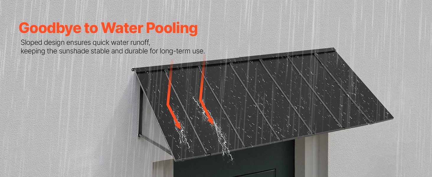 Tämä 104 × 36 tuuman metallikatos antaa laajan suojan oville, ikkunoille ja ulkotiloille. Se kestää tuulta, sadetta, lunta ja voimakasta auringonpaistetta. Kalteva muotoilu varmistaa tehokkaan vedenpoiston ja estää veden kertymisen katokselle.