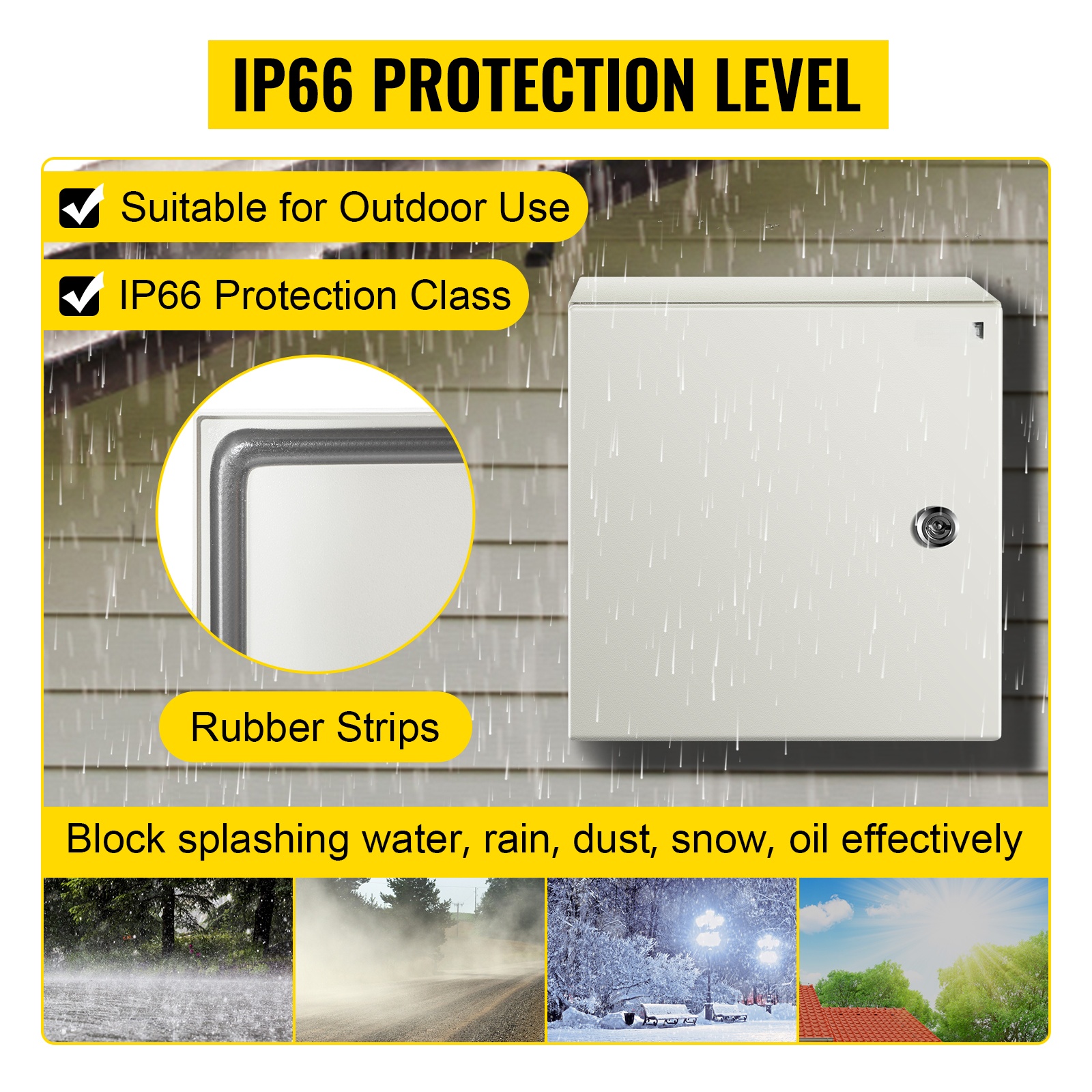IP66-suojaus tarkoittaa pölytiivistä rakennetta ja suojaa kosteudelta, vedeltä, sateelta ja öljyltä. Näin kotelon sisällä olevat sähkölaitteet pysyvät suojassa ja kuivina suositelluissa käyttöolosuhteissa. Ulkokäytössä suositellaan, että katolle kertyvä lumi poistetaan säännöllisesti, eikä lunta saa päästää kertymään rakenteen päälle.