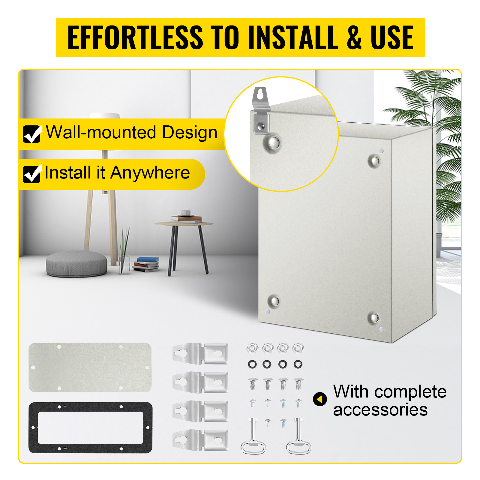 Pakkaus sisältää yhden sähkökotelon, kaksi avainta, asennetun 2 mm galvanoidun taustalevyn, seinäkiinnityssarjapaketin ja pohjan tiivistyslevyn.