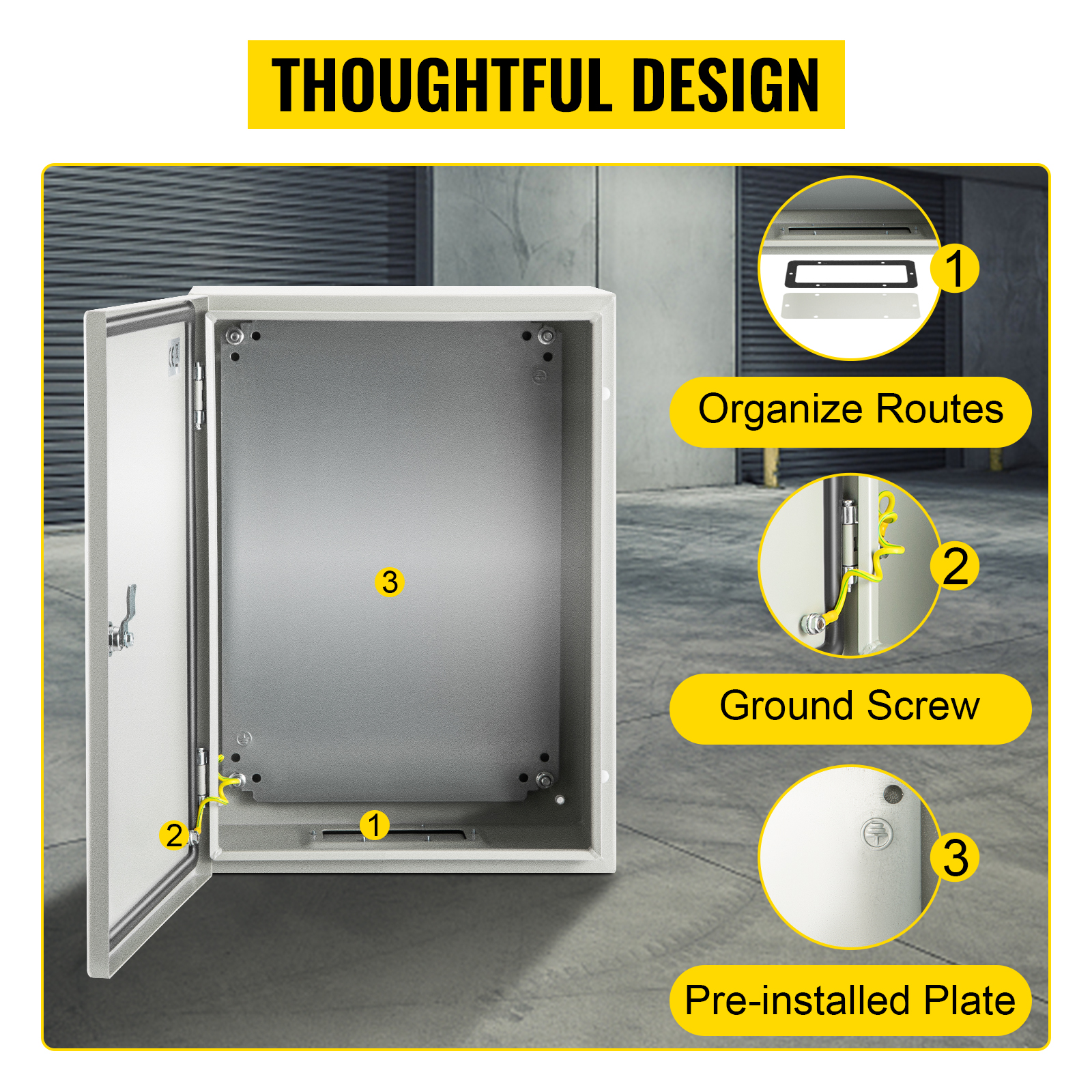 Irrotettava 2 mm galvanoitu taustalevy helpottaa piirilevyjen, kytkentärimojen ja muiden sähkökomponenttien kiinnittämistä. Koteloon on tehty neljä kiinnitysreikää taakse, joten sen seinäasennus käy vaivattomasti.
