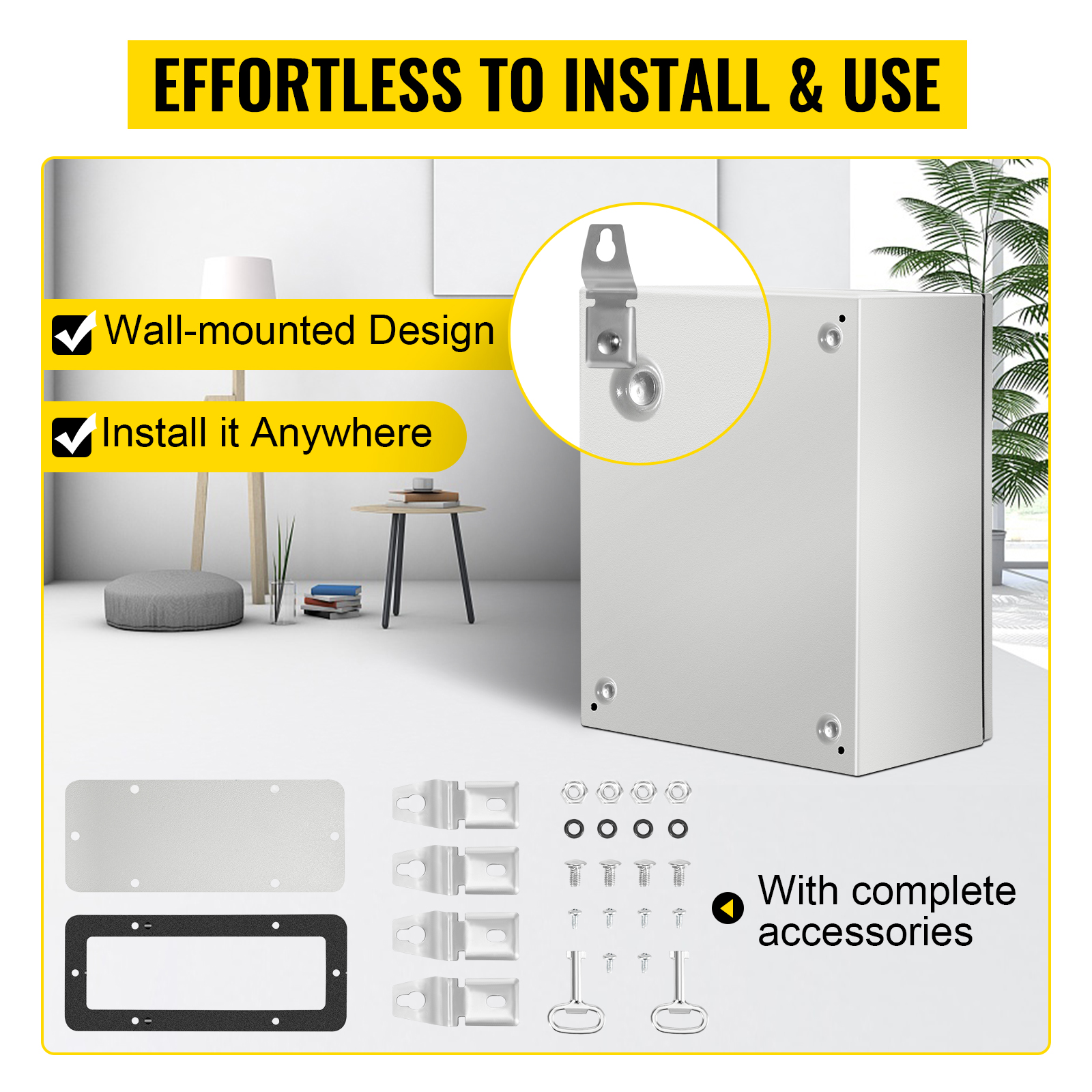 Pakkaukseen kuuluu 1 kpl sähkökotelo, 2 kpl avain, 1 kpl asennuslevy (asennettu kotelon sisään), 1 kpl seinäkiinnikesarja ja 1 kpl alaosan tiivistyslevy.