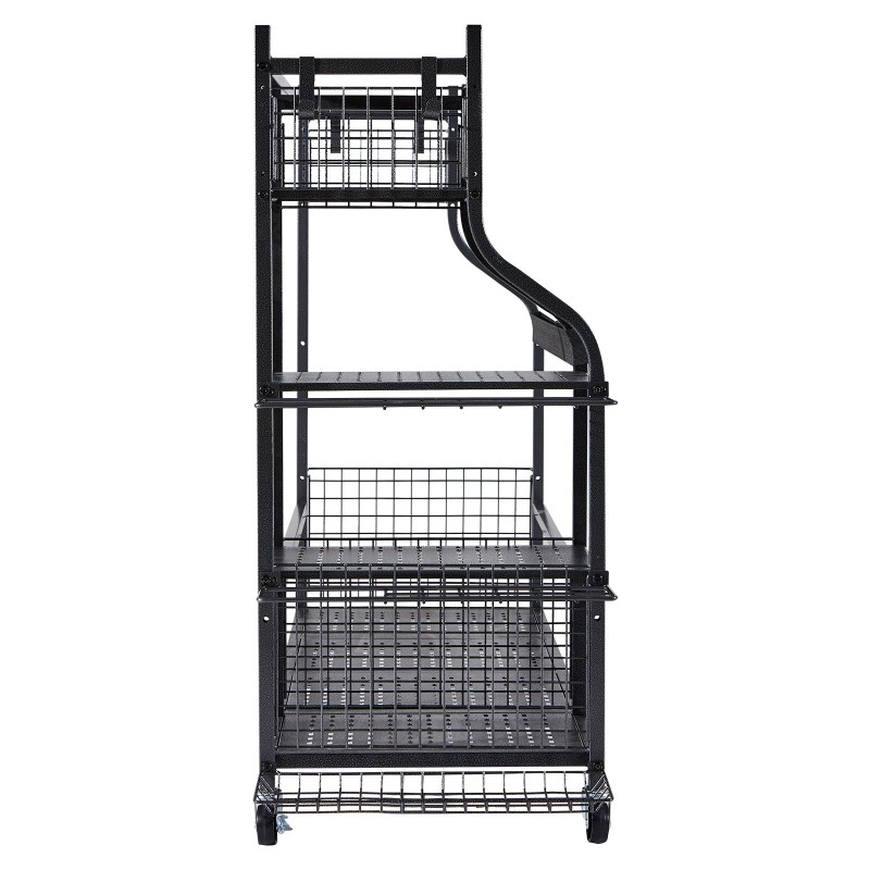 Tämä urheiluvarusteiden säilytyshylly auttaa pitämään golfbagit ja muun urheiluvälineistön siististi järjestyksessä. Useat korit, koukut ja tasot tarjoavat erilliset paikat mailoille, palloille, mailakasseille ja leikkikaluille, jolloin tila pysyy selkeänä ja helposti käytettävänä.