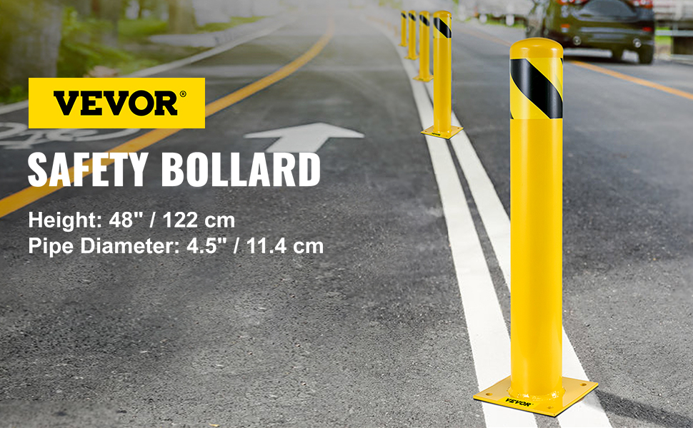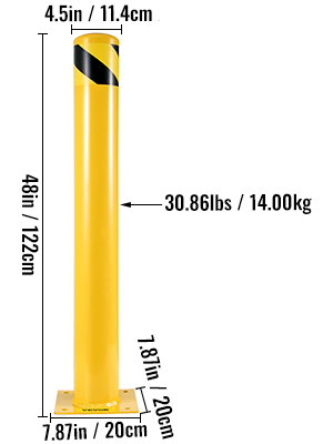 48" korkea ja 4.5" halkaisijaltaan oleva pollari, putken seinämäpaksuus 0.12", tarjoaa mekaanisen esteen, joka vähentää äkillisten ajoneuvotörmäysten aiheuttamia vahinkoja ajoneuvoille, rakenteille ja laitteille.