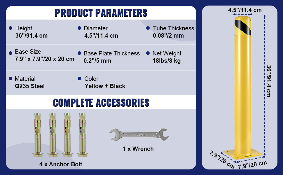 Turvapollarin korkeus on 91,4 cm, putken halkaisija 11,4 cm, jalustan koko 20 × 20 cm ja nettopaino 8 kg.
