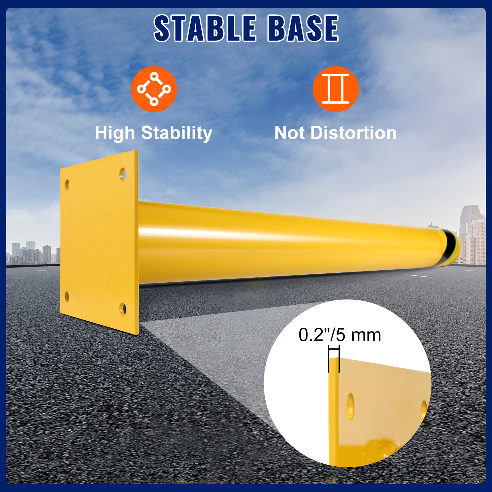 Tämä teräksinen turvapollari auttaa estämään ajoneuvojen törmäyksiä ja suojaamaan ihmisiä sekä rakenteita liikenneherkillä alueilla. Kirkkaan keltainen jauhemaalaus ja mustat raidat parantavat näkyvyyttä myös hämärässä, ja hitsattu, vankka rakenne kestää päivittäistä käyttöä sisällä ja ulkona.