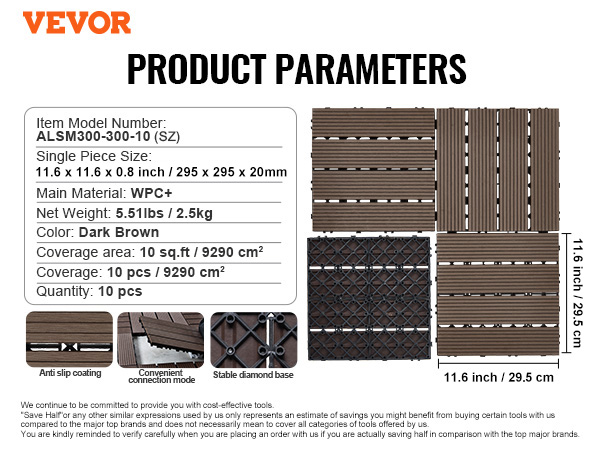 Yhden laatan koko on 300 mm × 300 mm × 20 mm. Kymmenen laatan yhteispaino on 2,5 kg.