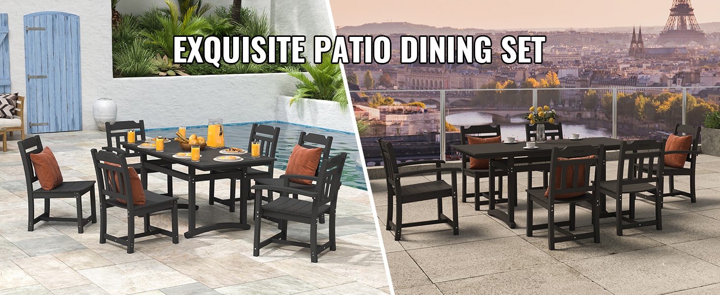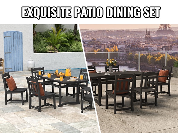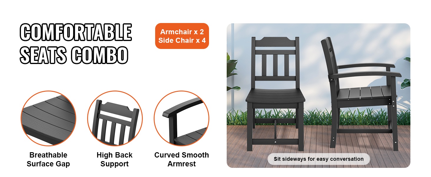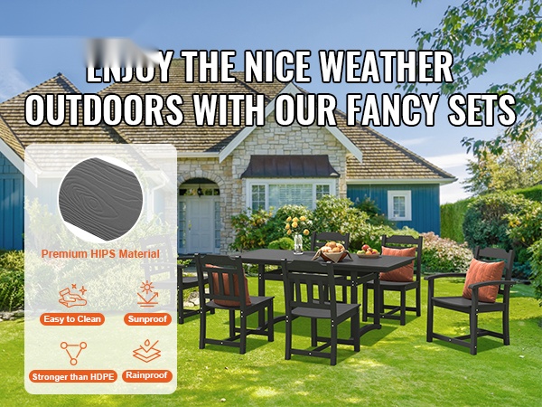 Terassiruokailuryhmä HIPS-muovi seitsemänosainen suorakaiteen pöytä kuusi tuolia musta ulkokäyttöön sopiva