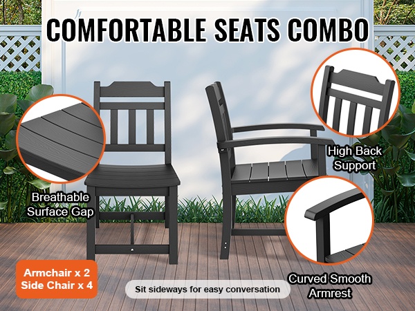 Tämä ulkokäyttöön suunniteltu ruokailuryhmä sisältää suorakaiteen muotoisen pöydän ja 6 tuolia. Säänkestävä rakenne kestää sateen ja auringonpaahteen, joten voit käyttää ryhmää terassilla, pihalla, parvekkeella tai uima-altaan äärellä huoletta.