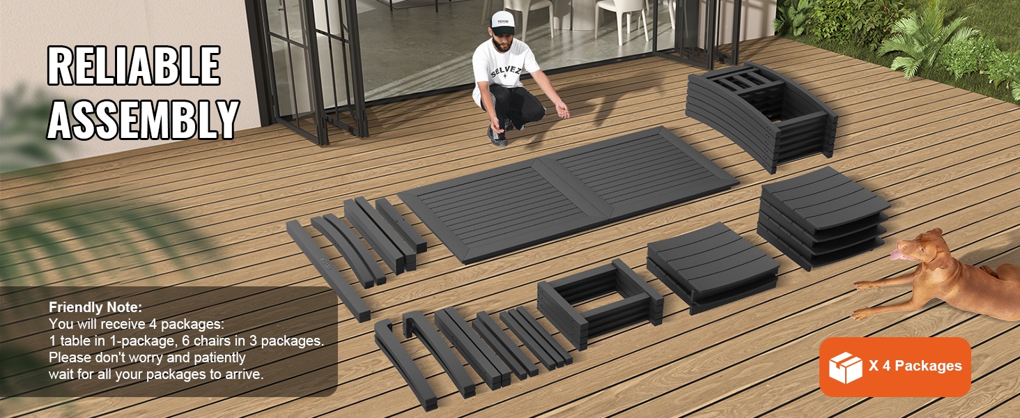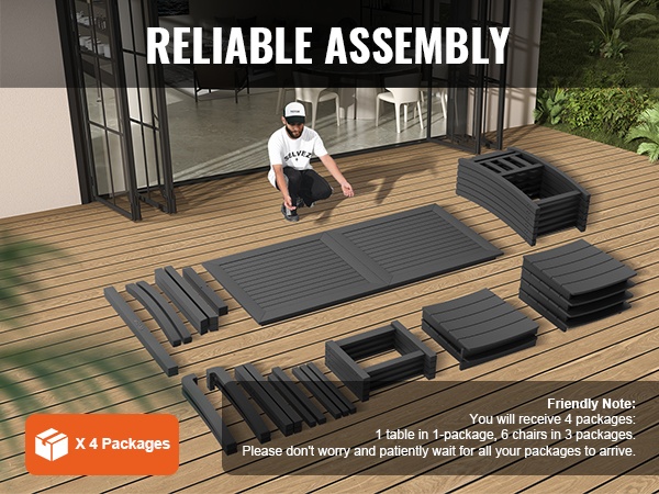 Setti toimitetaan 4 erillisessä pakkauksessa: 1 pöytä yhdessä paketissa ja 6 tuolia kolmessa paketissa. Tämä helpottaa käsittelyä ja kokoamista.