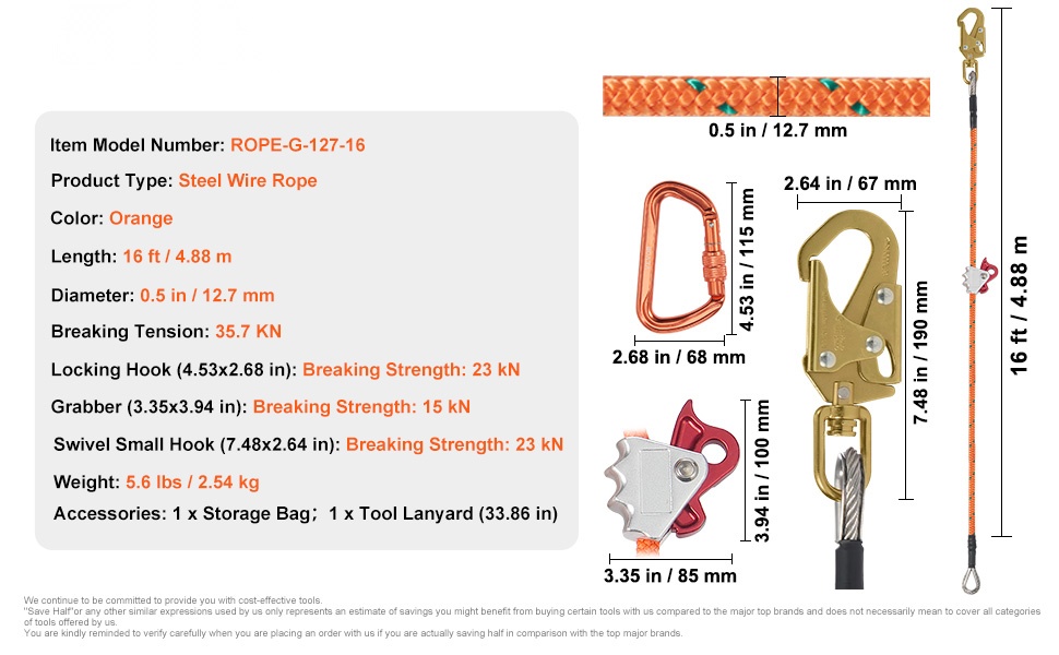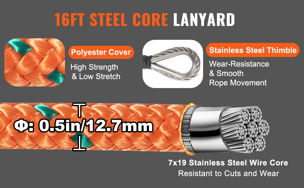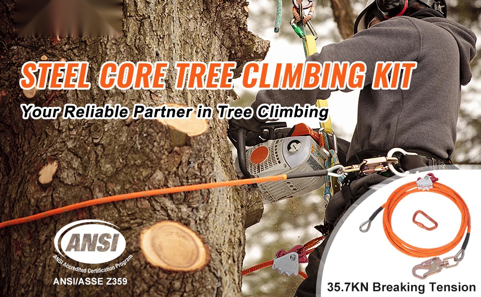 Teräsvaijeriydintä ja kulutusta kestävää polyesteripäällystettä käyttävä 12.7 mm teräsydin-köysi tarjoaa tukevan ja luotettavan tuen puissa työskentelyyn. Jäykkä rakenne helpottaa köyden hallintaa ja parantaa vakautta, kun liikut rungolla ja teet asennonvaihtoja.