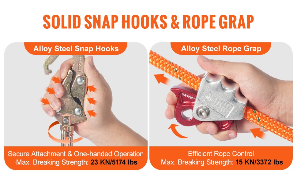 Kääntyvä lukkohaka, jonka murtolujuus on 23 kN (5174 paunaa), varmistaa luotettavan kiinnityksen turvavarusteisiin. Alumiiniseoksesta valmistettu köyden säädin, jonka murtolujuus on 15 kN (3372 paunaa), mahdollistaa köyden pituuden helpon ja tarkan säätämisen liikkeen aikana.