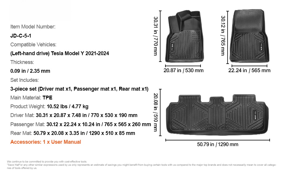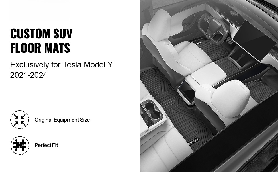Nämä Tesla Model Y -lattiamatot on muotoiltu ajoneuvon alkuperäisen lattian kaarien mukaan, joten ne sopivat tarkasti paikalleen ja pitävät auton sisätilat siisteinä ja järjestyksessä. Matot ovat mallikohtaiset, joten tarkista yhteensopivuus autosi mallin ja vuosimallin kanssa.