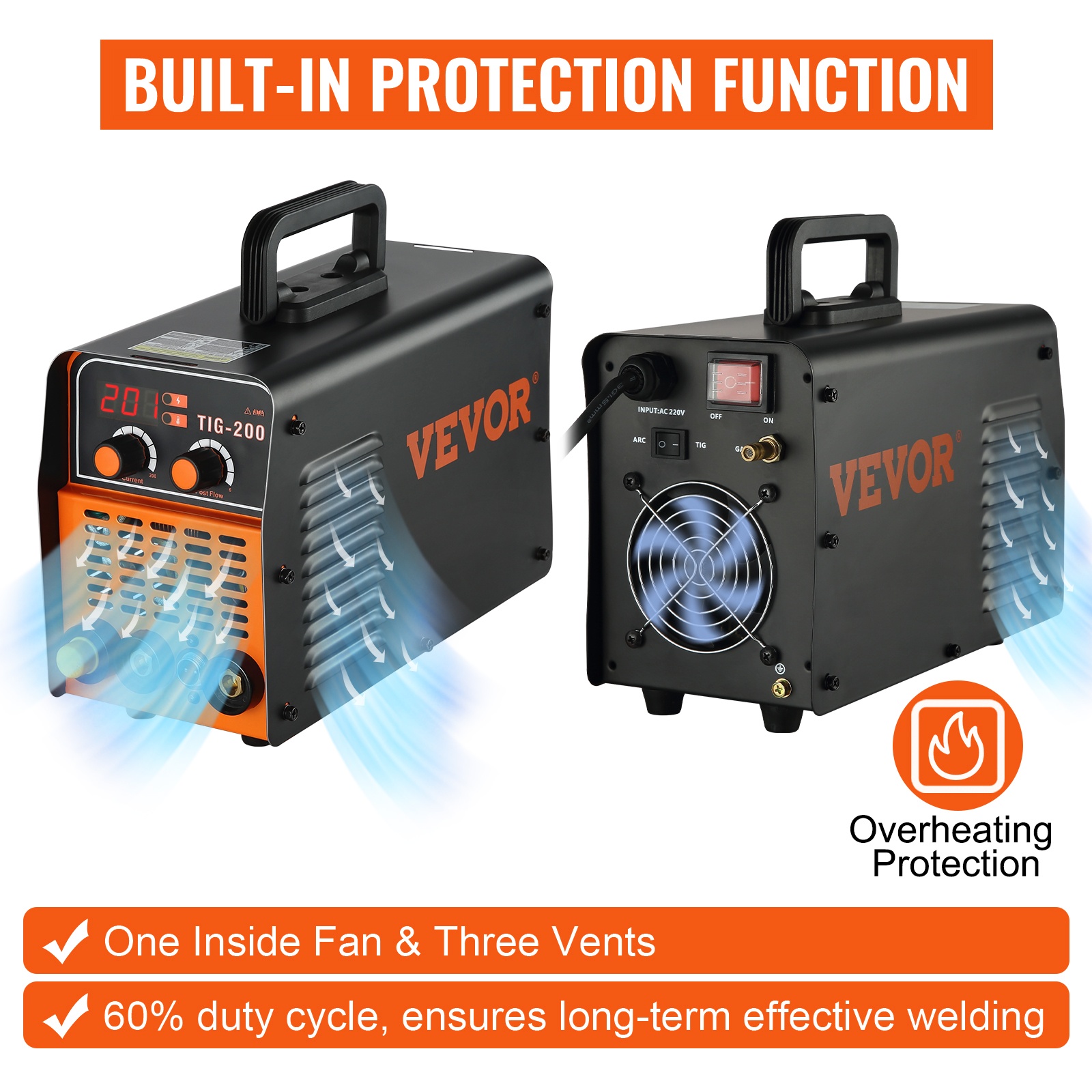 Hitsauskoneessa on turvatoiminto, joka katkaisee laitteen toiminnan automaattisesti liian korkean lämpötilan tai sallitun jännite- ja virtarajan ylittyessä. Sisäänrakennettu tuuletinjäähdytys tukee pitkäaikaista vakaata hitsausta.