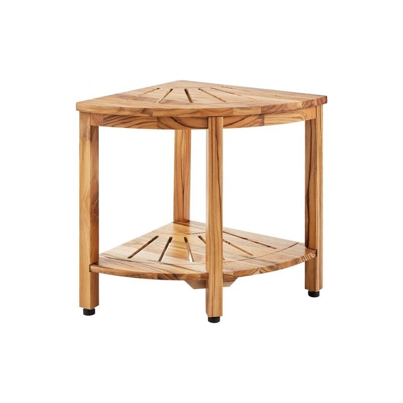 Tiikkinen kulmasuihkupenkki säilytyshylly korkeus 47 cm kantavuus 226 kg sisä ja ulkokäyttöön