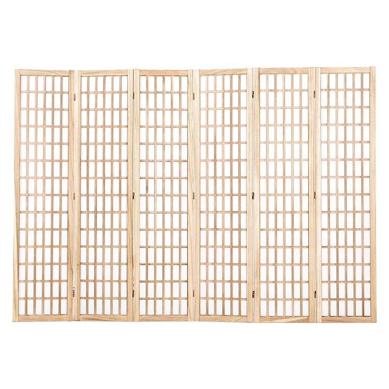 6-paneelinen japanilaistyylinen tilanjakaja tuo kotiin, toimistoon tai ravintolaan kevyen ja selkeän ilmeen. Puisesta ruudukosta ja kuitukankaasta valmistettu taitettava serme toimii sekä näkösuojana että sisustuselementtinä, ja sopii hyvin huoneiden jakamiseen, työrauhan luomiseen tai makuutilan rajaamiseen.