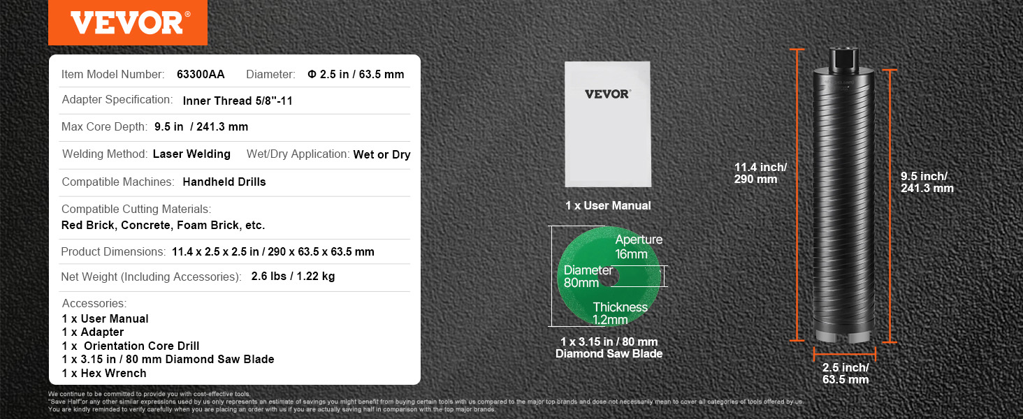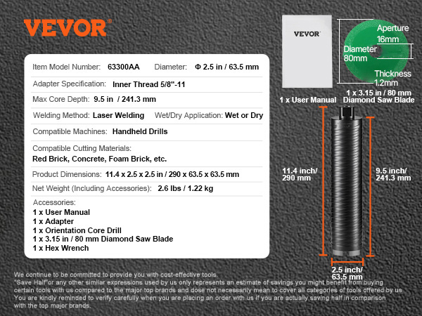 Halkaisija on 63,5 mm ja sisäkierre on 5/8‑11, tarkoitettu käsikäyttöisiin porakoneisiin.