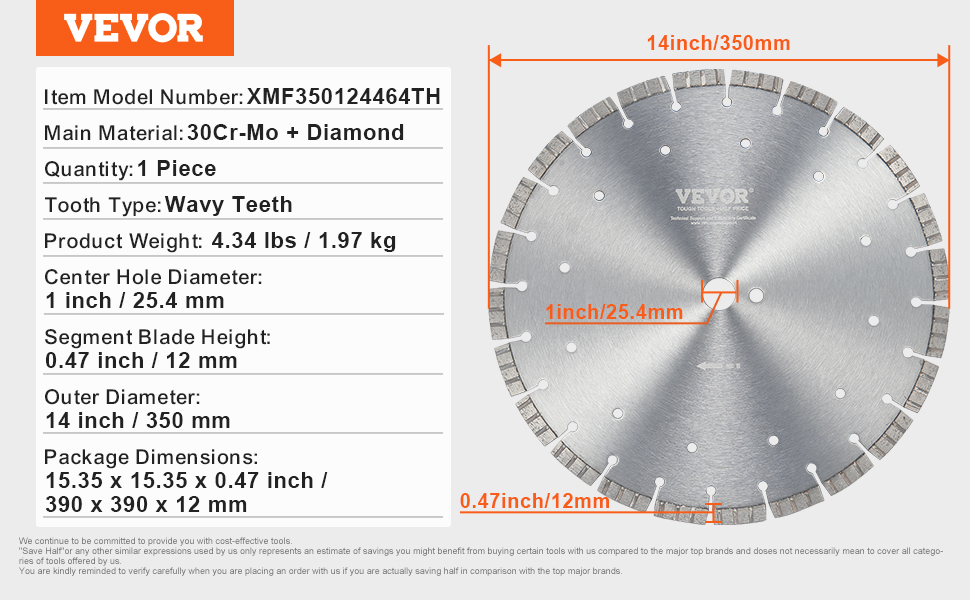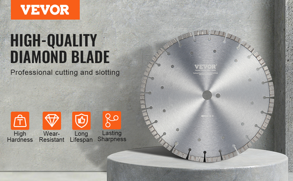 Tämä 350 mm timanttilaikka on suunniteltu betonin ja muiden kivipohjaisten materiaalien tarkkaan katkaisuun kuivana tai märkänä. 30Cr-Mo-seosteräksestä valmistettu runko ja tiheät timanttisegmentit tarjoavat korkean kovuuden, kulutuskestävyyden ja pitkän käyttöiän.