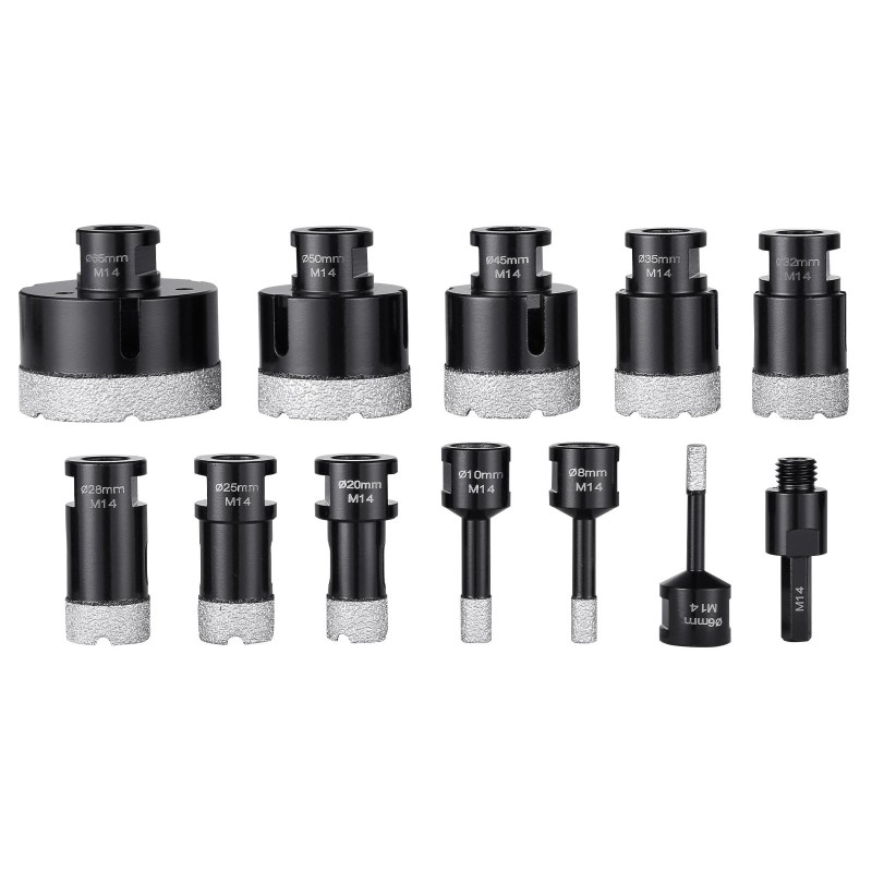 Tämä timanttinen reikäsahasarja sisältää 11 erikokoista poranterää ja M14-liittimen, jotka soveltuvat sekä kuivaan että märkään poraukseen. Sarja on suunniteltu erityisesti kovien materiaalien, kuten kaakelin, graniitin, marmorin, kivimateriaalien ja keramiikan, siistiin ja tarkkaan rei’itykseen.