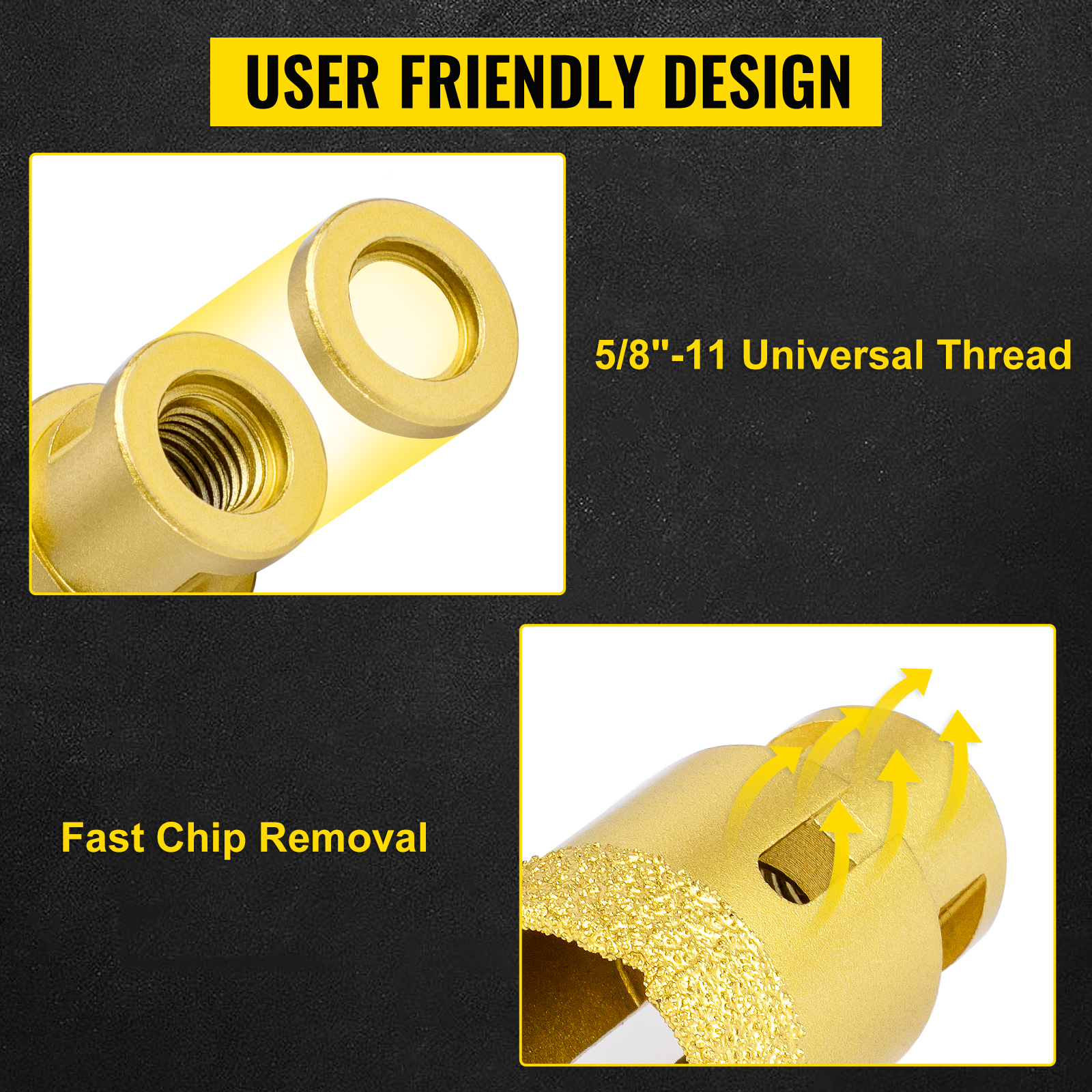 5/8" yleiskierre sopii useimpiin kulmahiomakoneisiin. Molemmille puolille sijoitetut suuret lastunpoistoaukot nopeuttavat lastunpoistoa ja vähentävät tukkeutumista porauksen aikana.