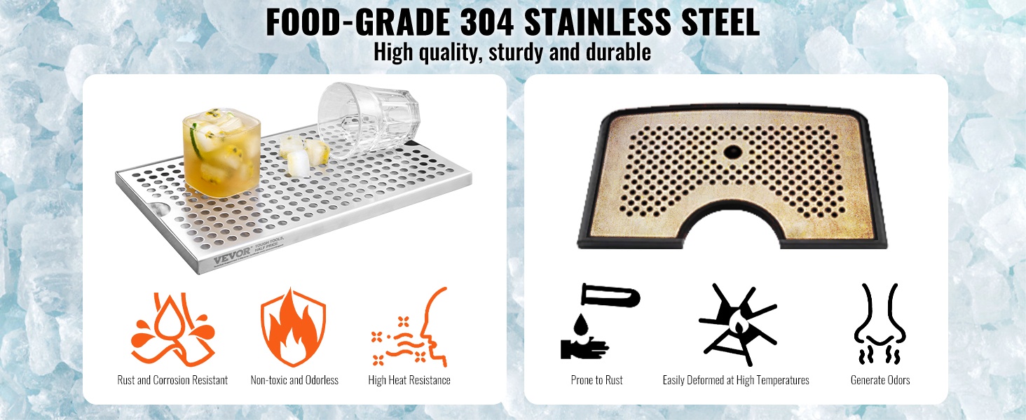 Oluttornin tippa-allas on valmistettu ruostumattomasta teräksestä, joka kestää ruostetta, korroosiota sekä korkeita ja matalia lämpötiloja. Materiaali on tukeva ja pitkäikäinen, ja sileä pinta helpottaa puhdistusta.