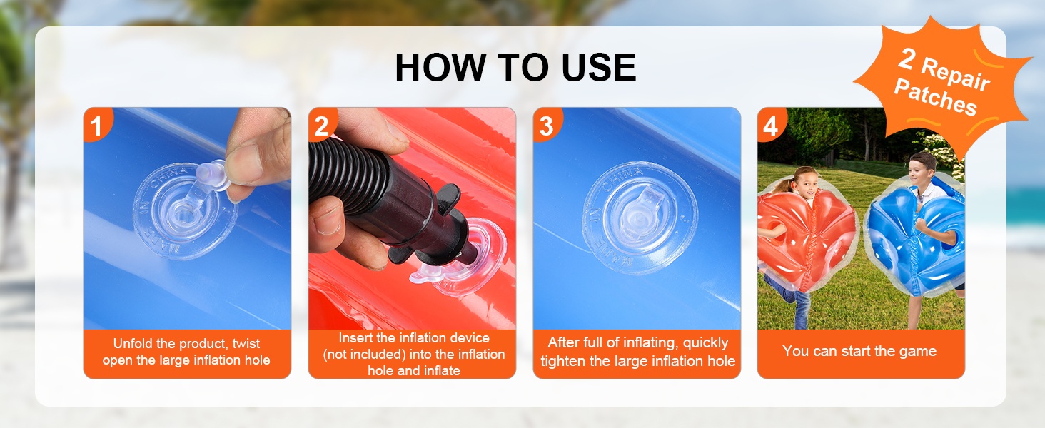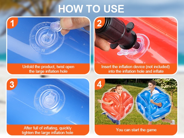 Palloa on yksinkertaista käyttää: pakkaukseen sisältyy yksityiskohtainen käyttöohje ja 2 korjauspaikkaa. Käyttöönotto sujuu helposti – levitä pallo, avaa suuri täyttöventtiili, täytä ilmapumpulla (ei sisälly toimitukseen) ja kiristä venttiili nopeasti, kun pallo on täynnä. Tämän jälkeen pallo on valmis peliin.