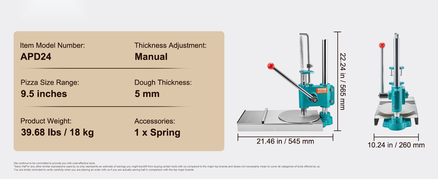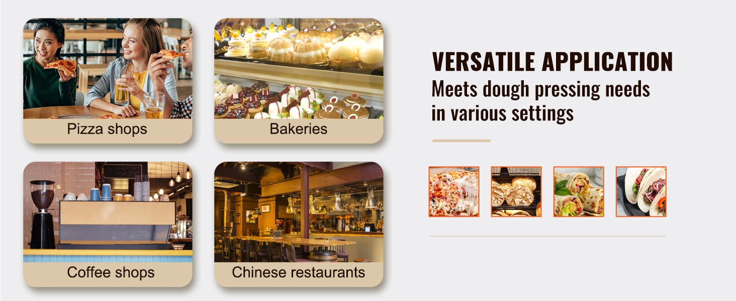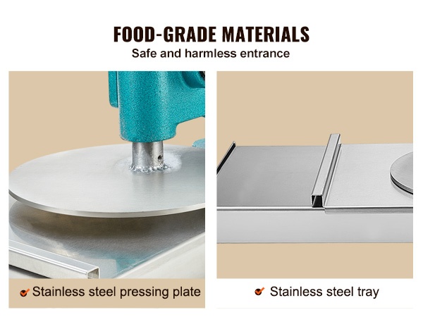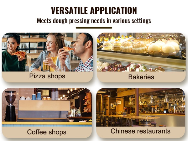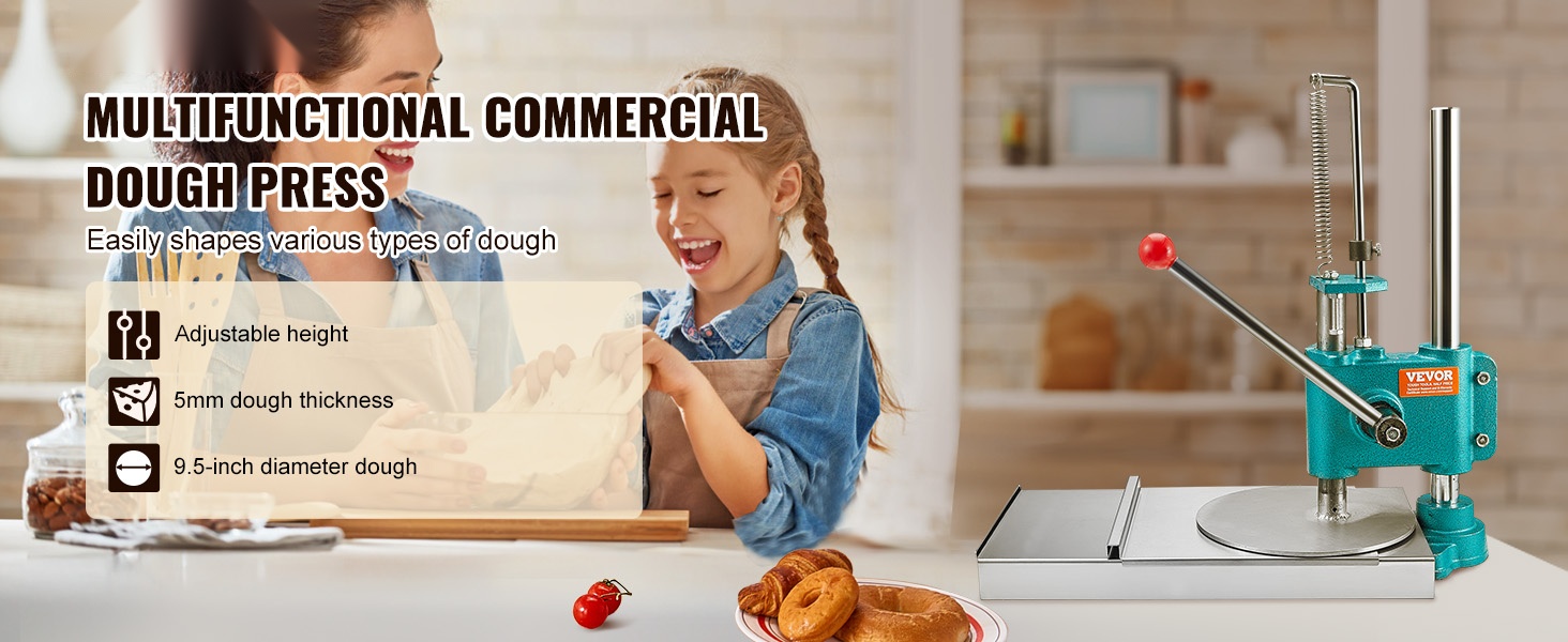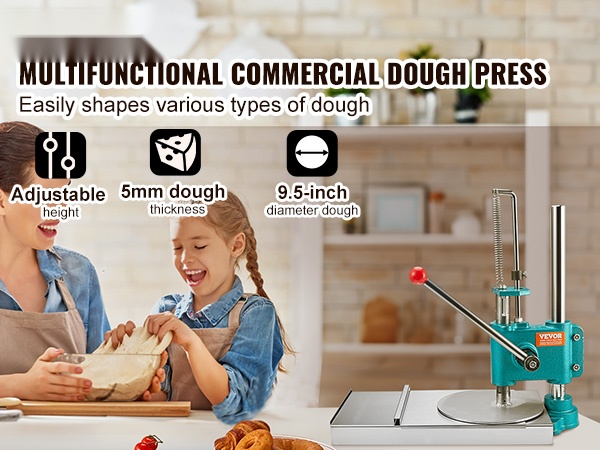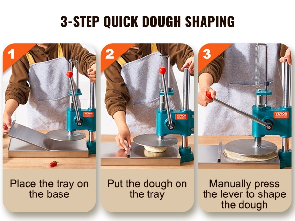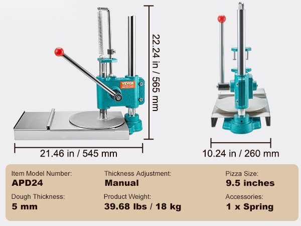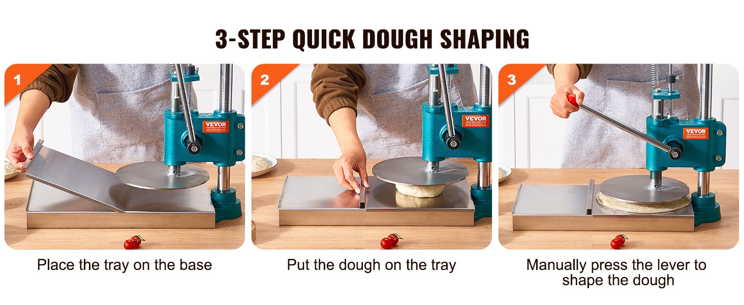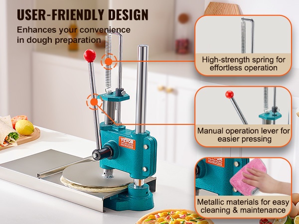 Tämä manuaalinen pizzataikinan prässi sopii tortillojen, pizzapohjien ja erilaisten leivonnaisten valmistukseen. Se on käyttökelpoinen kotikeittiössä, pienissä leipomoissa, kahviloissa ja muissa kevyissä ammattikeittiöissä.