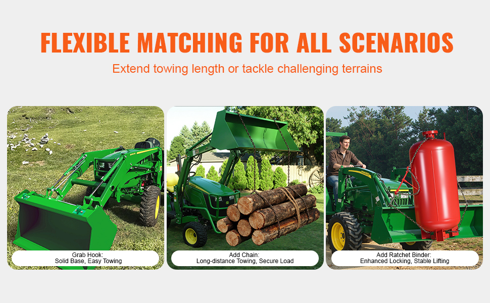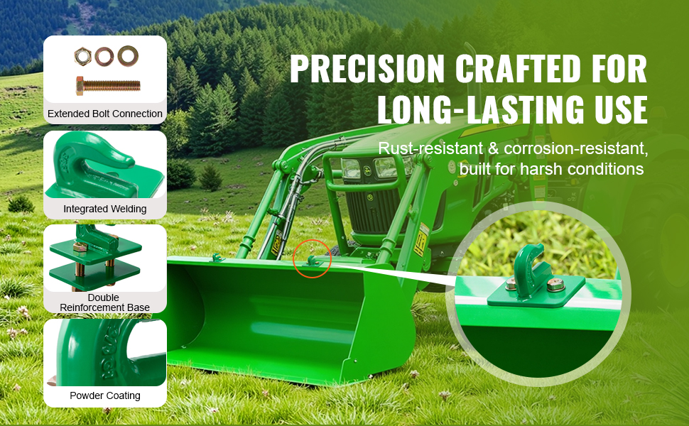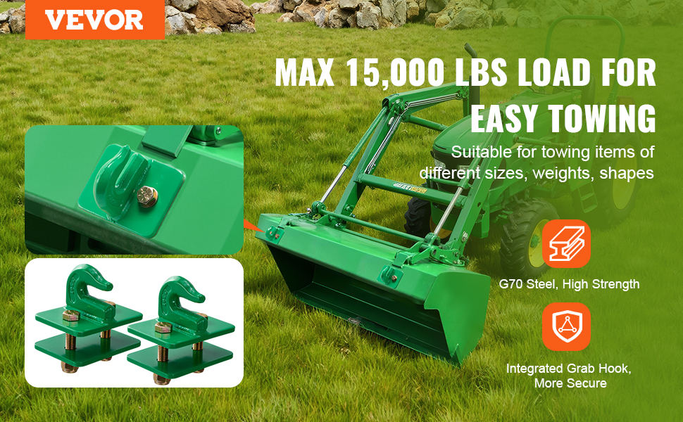 3/8" kauhahakaset traktoreihin tarjoavat luotettavan kiinnityspisteen vetoon, nostoon ja kuorman varmistamiseen. Korkean lujuusluokan teräsrakenne ja taustalevy takaavat tukevan asennuksen erilaisiin kauhoihin ja ajoneuvoihin, kuten traktoreihin, maatalousajoneuvoihin, maastureihin ja pick-upeihin.