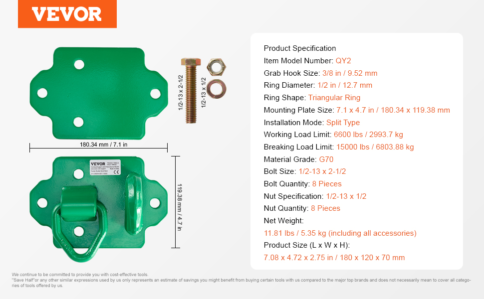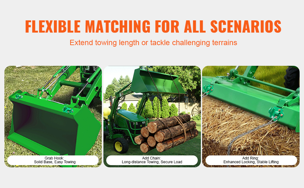 Traktorin grab-koukut käyttävät 3/9" vakioketjukokoa ja ovat yhteensopivia useimpien ajoneuvojen, kuten maatalouskoneiden, traktorin kauhojen ja maastoajoneuvojen kanssa. Koukkuja voi käyttää yhä uudelleen, ja ne sopivat hyvin myös hätätilanteisiin, vähentäen tarvetta toistuviin hankintoihin.