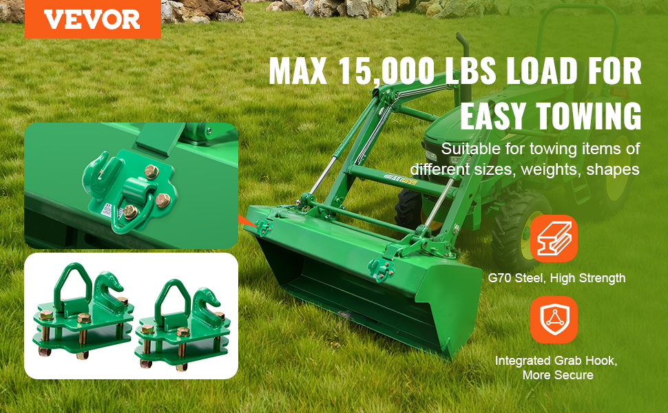 Traktorin kauhan koukut on valmistettu G70-lujuusteräksestä ja niissä on vankka rakenne. Koukut soveltuvat monen kokoisille ja painoisille kuormille, ja niiden suurin kuormankantokyky on 15,001 paunaa. Tämä helpottaa perävaunujen ja muiden kuormien vetotehtäviä.